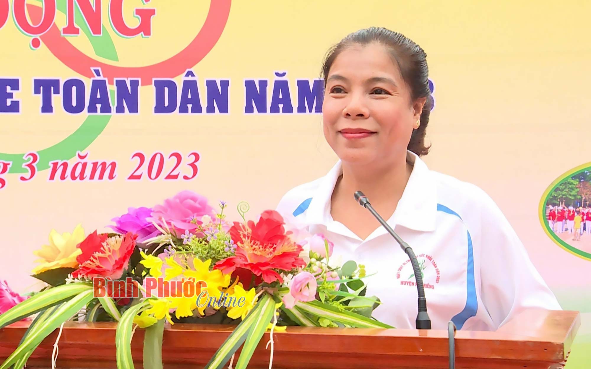 Tỉnh ủy viên, Bí thư Huyện ủy Phú Riềng Nguyễn Thị Xuân Hòa đọc “Lời kêu gọi toàn dân tập thể dục” của Chủ tịch Hồ Chí Minh tại lễ phát động