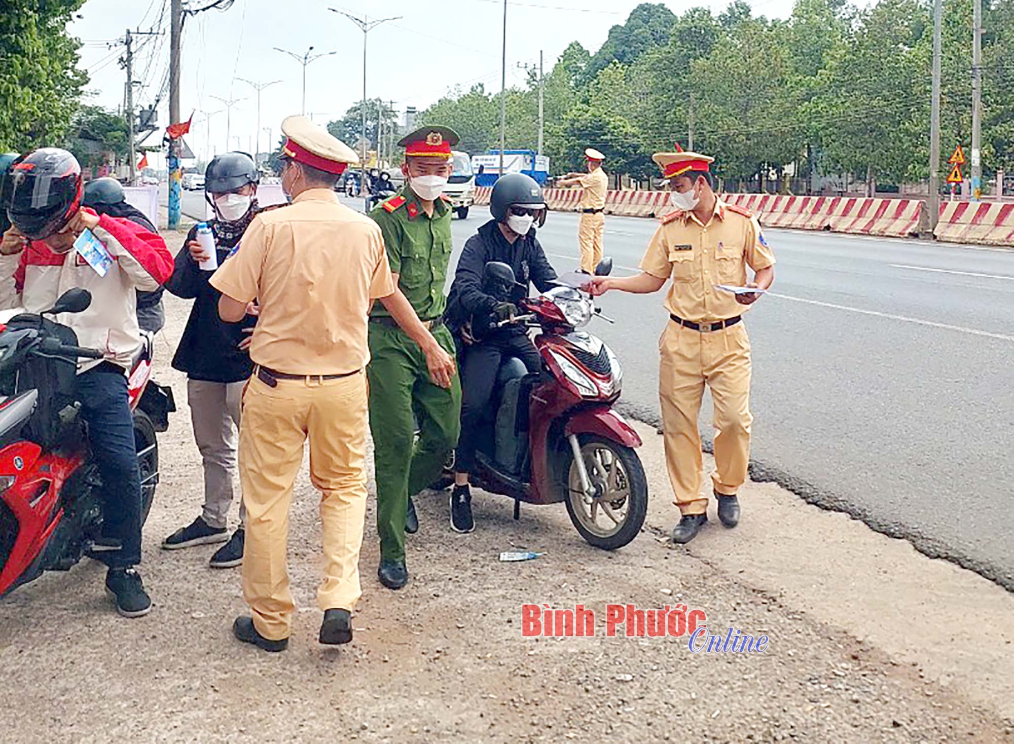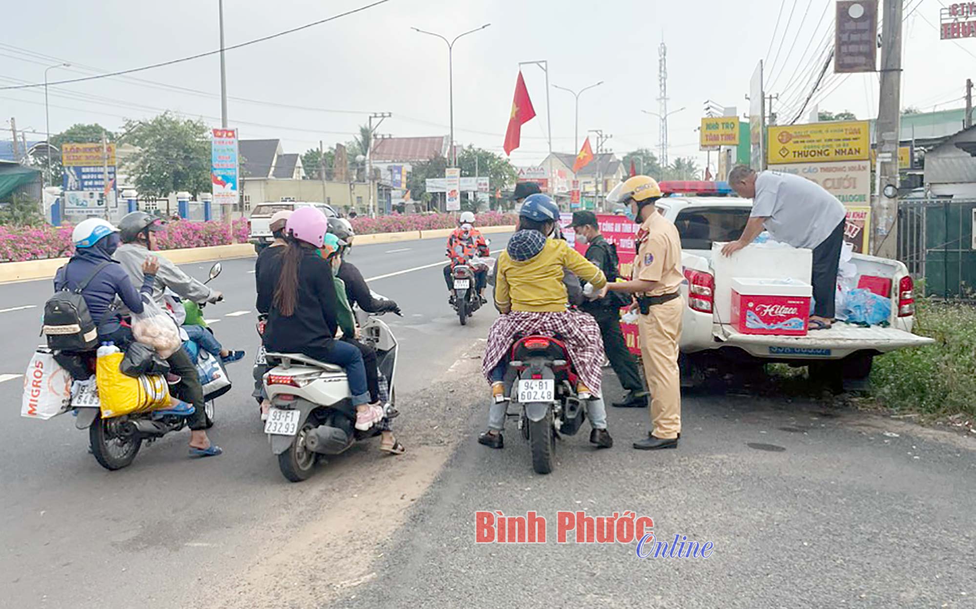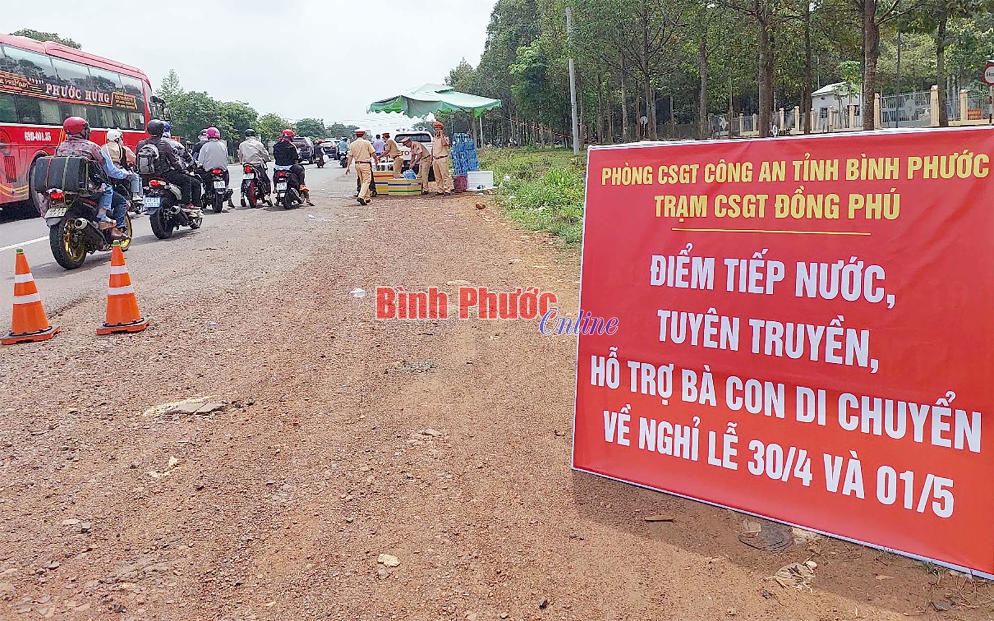 Từ chiều 28-4, lượng môtô, xe máy, ôtô con và xe khách di chuyển qua địa bàn tỉnh Bình Phước về Tây Nguyên rất đông. Nhiều nhất vẫn là môtô, xe máy của công nhân từ TP. Hồ Chí Minh và các tỉnh miền Đông Nam Bộ về Tây Nguyên. Để tổ chức phục vụ cho người dân tận tình, chu đáo, lực lượng CSGT mà chủ công là Chi đoàn Phòng CSGT Công an tỉnh đã bố trí cán bộ, chiến sĩ sắp xếp công việc hợp lý, thay phiên nhau trực tiếp nước và khăn lạnh cho người dân. Ngoài ra, lực lượng chức năng còn dựng pa-nô và phát loa phóng thanh tuyên truyền người dân tham gia giao thông an toàn, đúng luật.