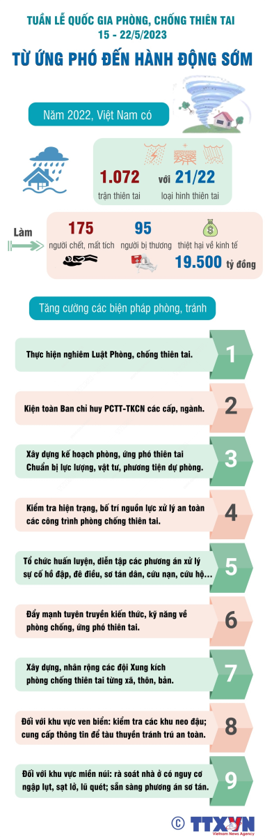 Tuần lễ Quốc gia phòng, chống thiên tai năm 2023 (từ ngày 15 đến 22-5-2023) có chủ đề “Từ ứng phó đến hành động sớm”, với mục tiêu tăng cường thông tin truyền thông; nâng cao năng lực cộng đồng, nâng cao tinh thần, trách nhiệm của các cấp, các ngành từ Trung ương đến địa phương trong công tác phòng chống thiên tai; sẵn sàng các phương án ứng phó với thiên tai năm 2023. Tuần lễ Quốc gia Quốc gia phòng, chống thiên tai cũng đề cao vai trò, trách nhiệm trong năm Việt Nam làm Chủ tịch Ủy ban ASEAN về Quản lý thiên tai.