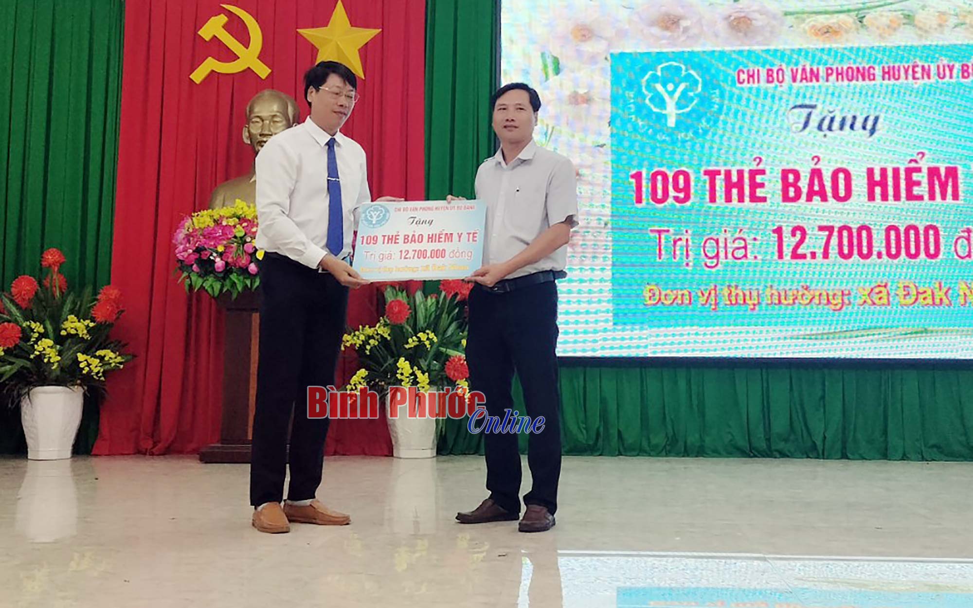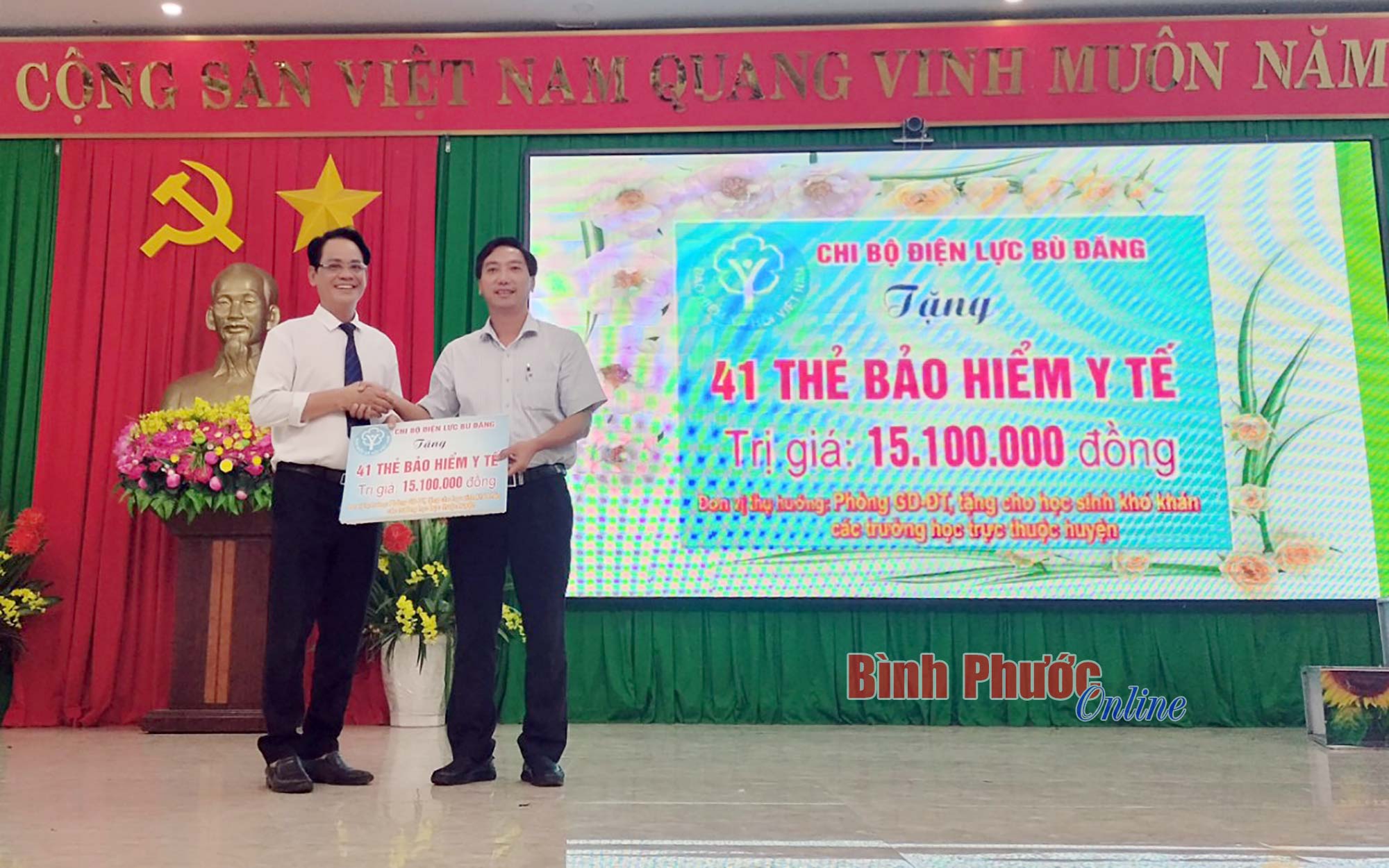 Đại diện các chi bộ trao bảng tượng trưng phong trào tặng thẻ bảo hiểm y tế cho học sinh, bệnh nhân và hộ gia đình khó khăn