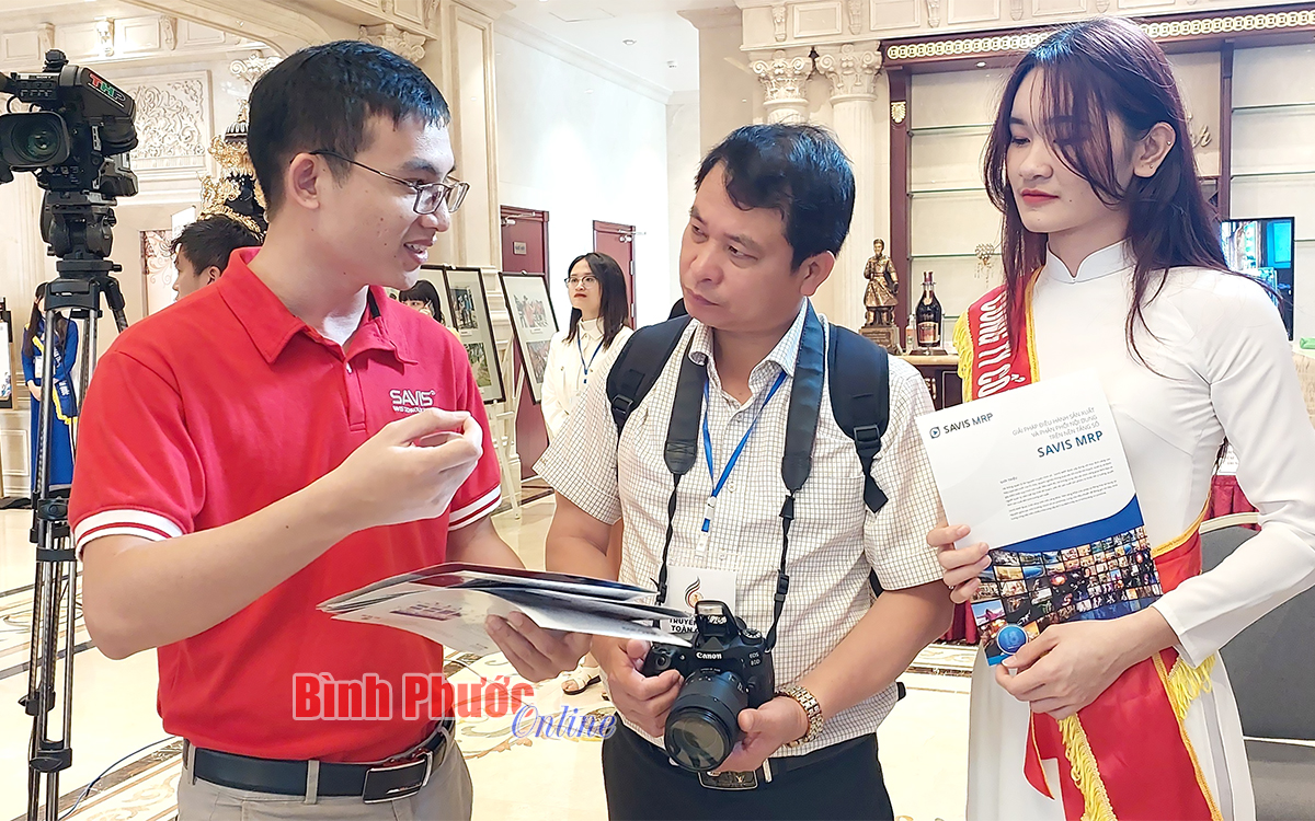 Tác giả Quang Minh (giữa) tác nghiệp tại triển lãm công nghệ kỹ thuật truyền hình, hoạt động trong khuôn khổ Liên hoan truyền hình toàn quốc lần thứ 41 tại thành phố Hải Phòng
