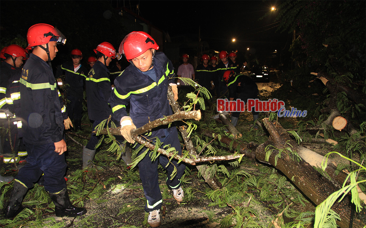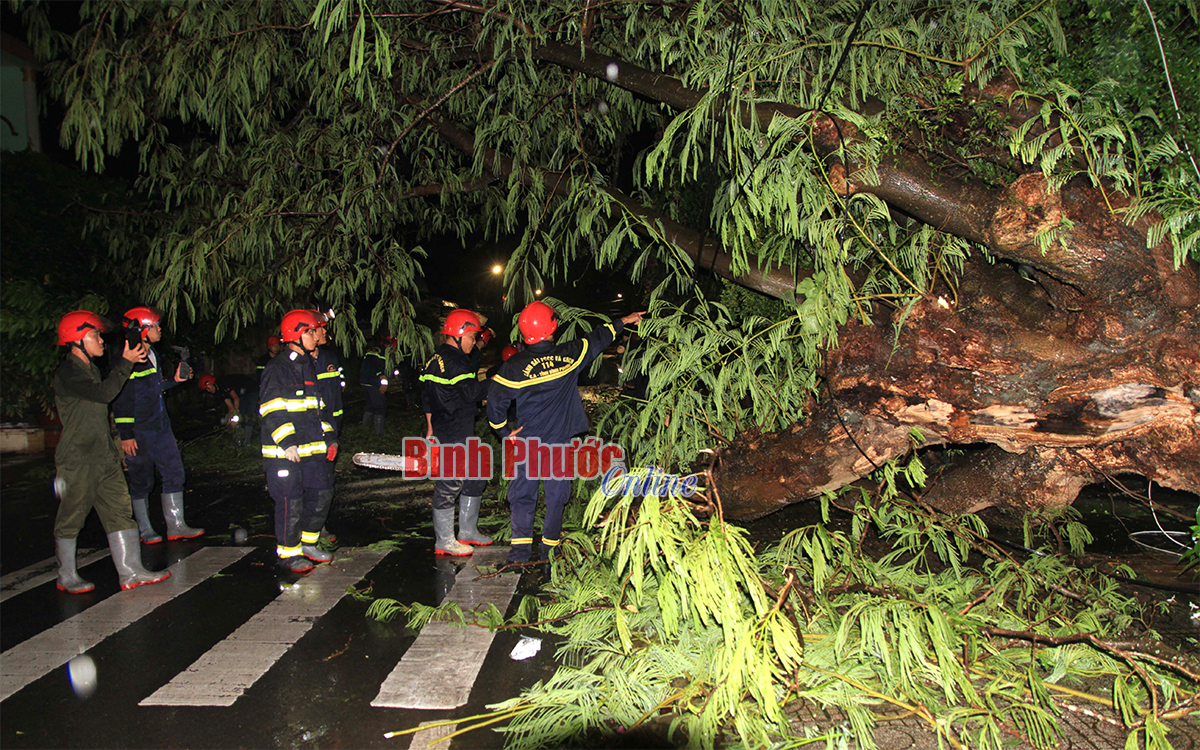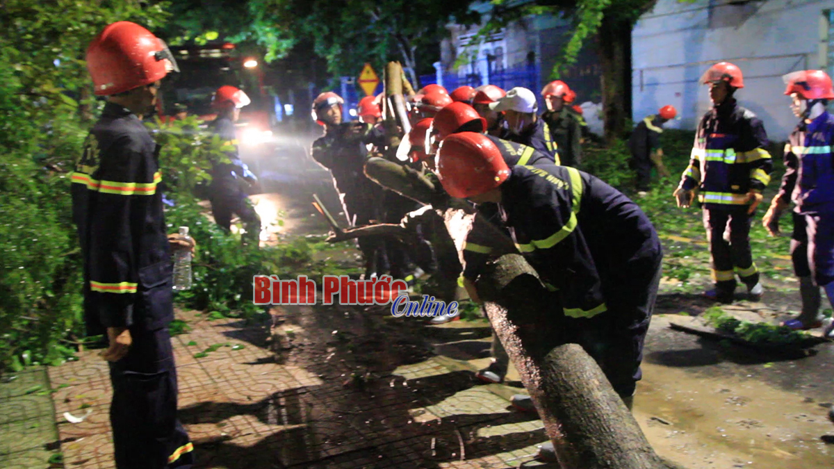 Tại giao lộ đường Trường Chinh và Nguyễn Thị Định, phường Tân Phú, thành phố Đồng Xoài, một cây lớn bật gốc chắn ngang đầu đường Nguyễn Thị Định và đè lên đường dây điện. Để xử lý cây lớn này lực lượng cứu hộ phải phối hợp với Điện lực thành phố cắt điện trước khi tổ chức cắt dọn. Do cây lớn nhiều cành lá nên phải nhờ đến xe cẩu chuyên dụng của cơ quan điện lực đưa cán bộ cứu hộ sử dụng cưa máy lên cao tiến hành cắt dần các cành cây.