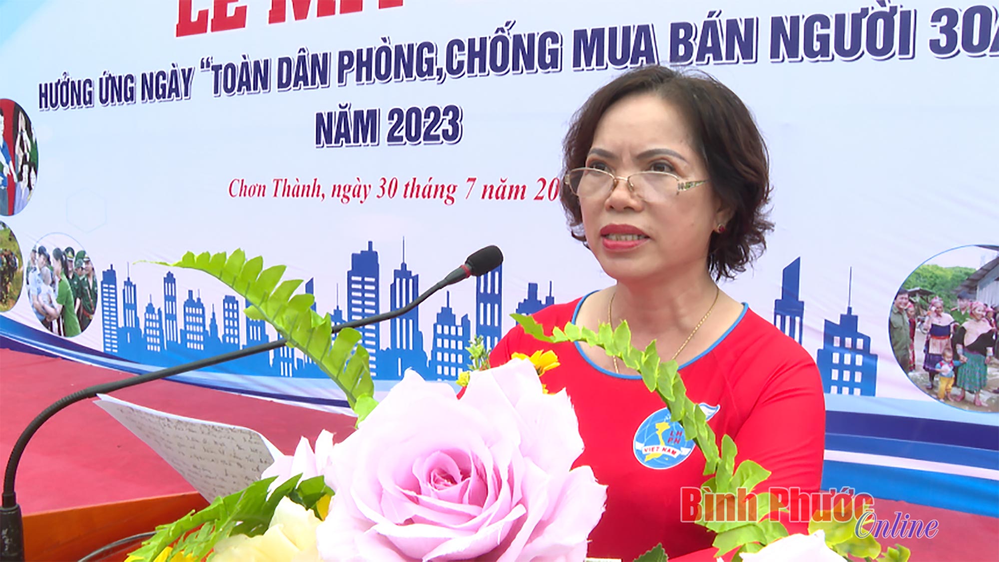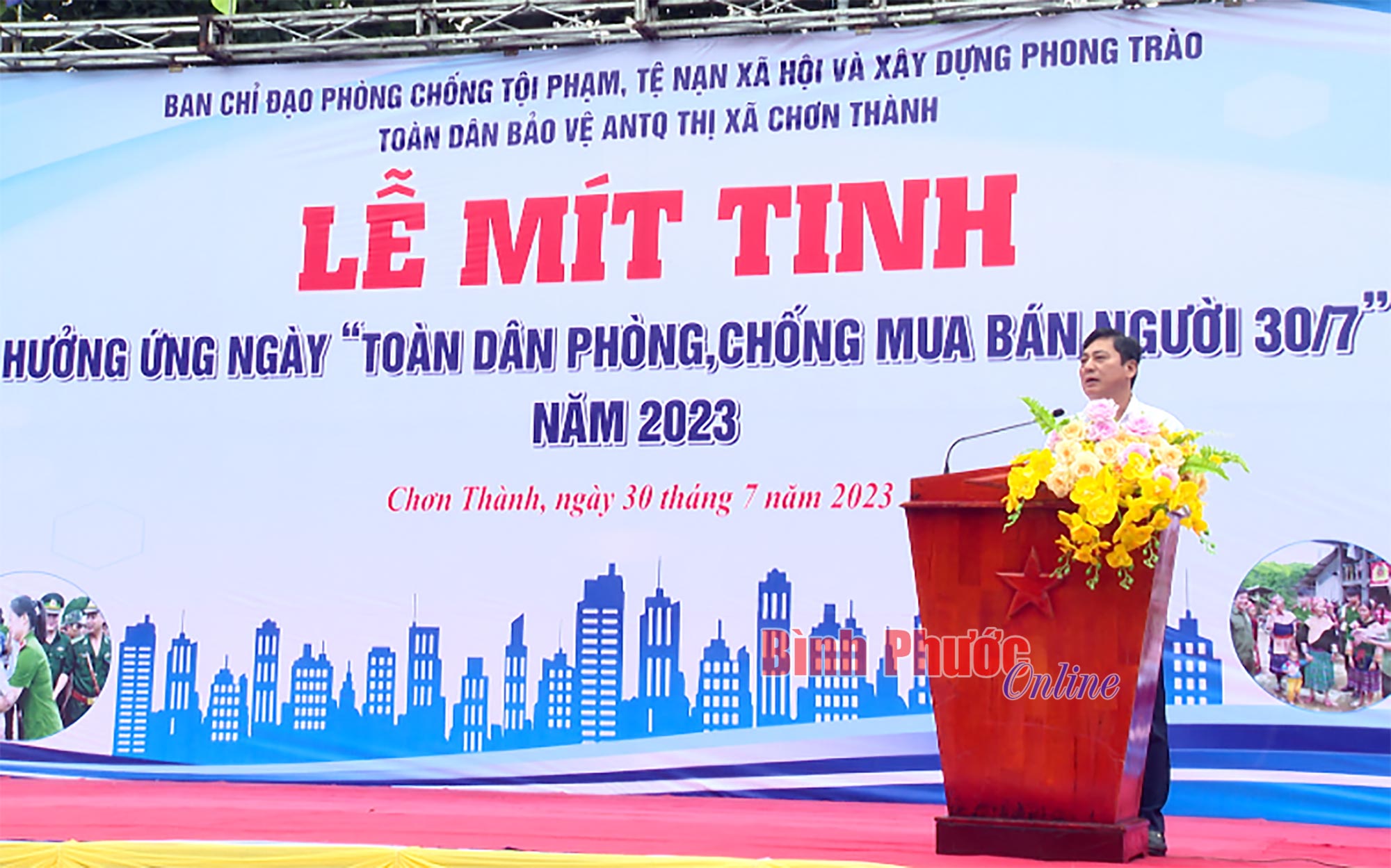 Phát biểu tại buổi lễ, Chủ tịch UBND thị xã Chơn Thành Hà Duy Đạt đã đề nghị các cấp, ngành, đoàn thể chính trị nâng cao vai trò, trách nhiệm, tập trung lãnh đạo, chỉ đạo tổ chức thực hiện có hiệu quả về công tác phòng, chống tội phạm nói chung và phòng, chống mua bán người nói riêng. Tăng cường công tác quản lý nhà nước về cư trú, xuất nhập cảnh, ngành nghề kinh doanh dịch vụ; xử lý kịp thời tố giác, tin báo, điều tra, truy tố, xét xử nghiêm minh tội mua bán người theo quy định...