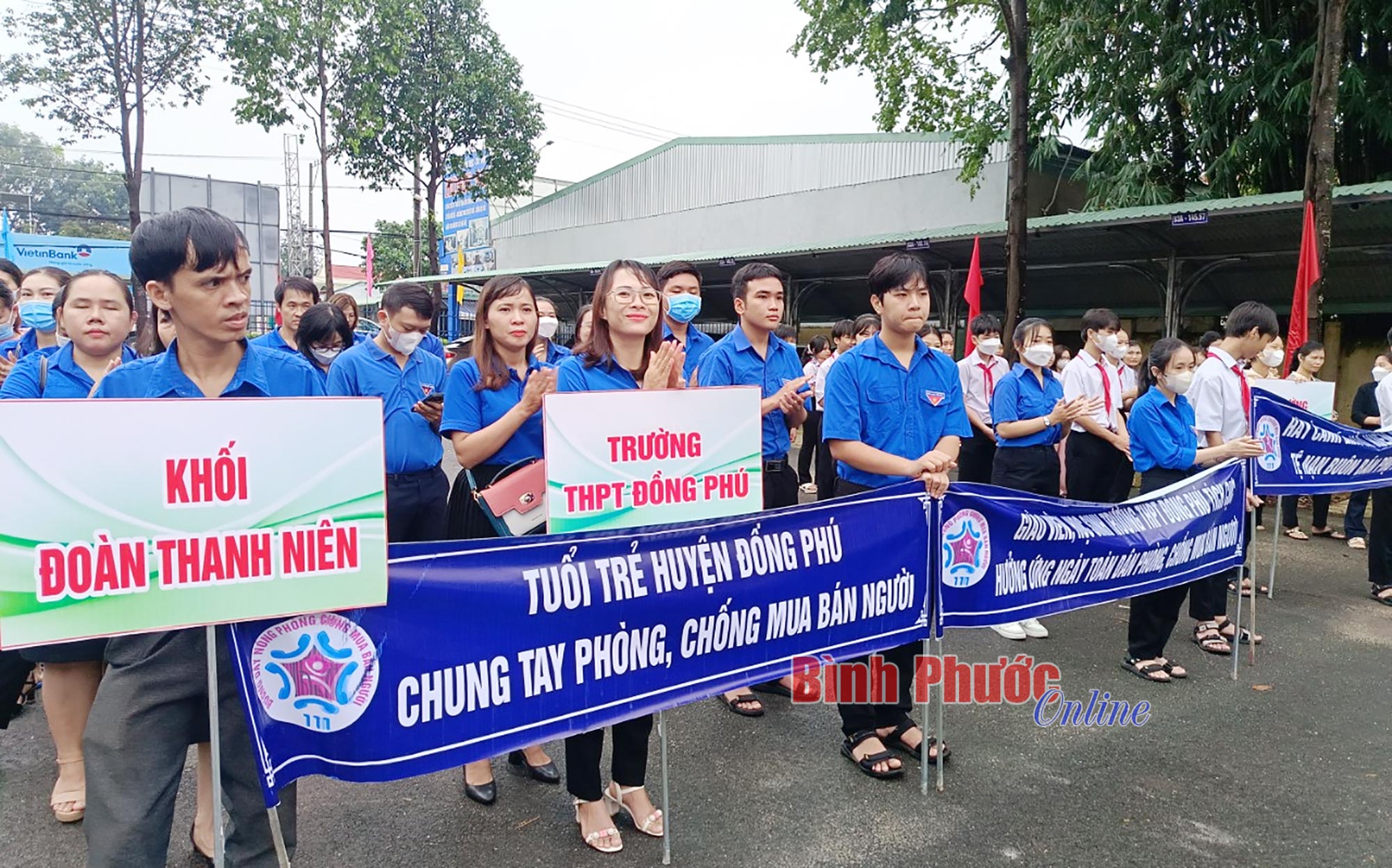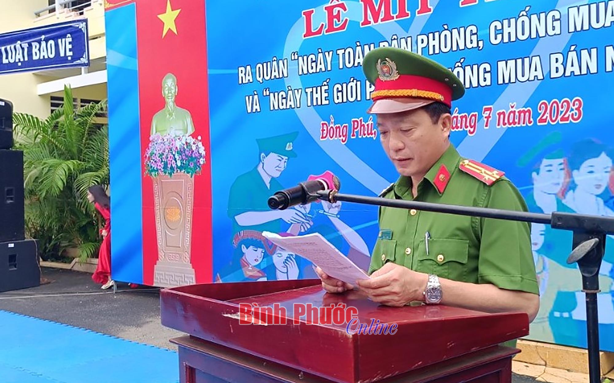 Phát biểu tại buổi lễ, lãnh đạo huyện Đồng Phú nhấn mạnh, những năm gần đây, lợi dụng chính sách mở cửa, hội nhập, thông thoáng trong xuất cảnh, nhất là sự nhẹ dạ, cả tin, mất cảnh giác của người dân, tội phạm mua bán người diễn biến phức tạp với nhiều thủ đoạn tinh vi. Chúng câu kết, hình thành các đường dây đưa người ra nước ngoài, bán vào các động mại dâm, cưỡng ép kết hôn hoặc lao động cưỡng bức, gây nhiều bức xúc trong xã hội. Đồng Phú là huyện đang trên đà phát triển, lực lượng lao động nhiều, đồng bào dân tộc thiểu số cao, trình độ dân trí chưa đồng đều, là những yếu tố tiềm ẩn nguy cơ tội phạm mua bán người hoạt động.