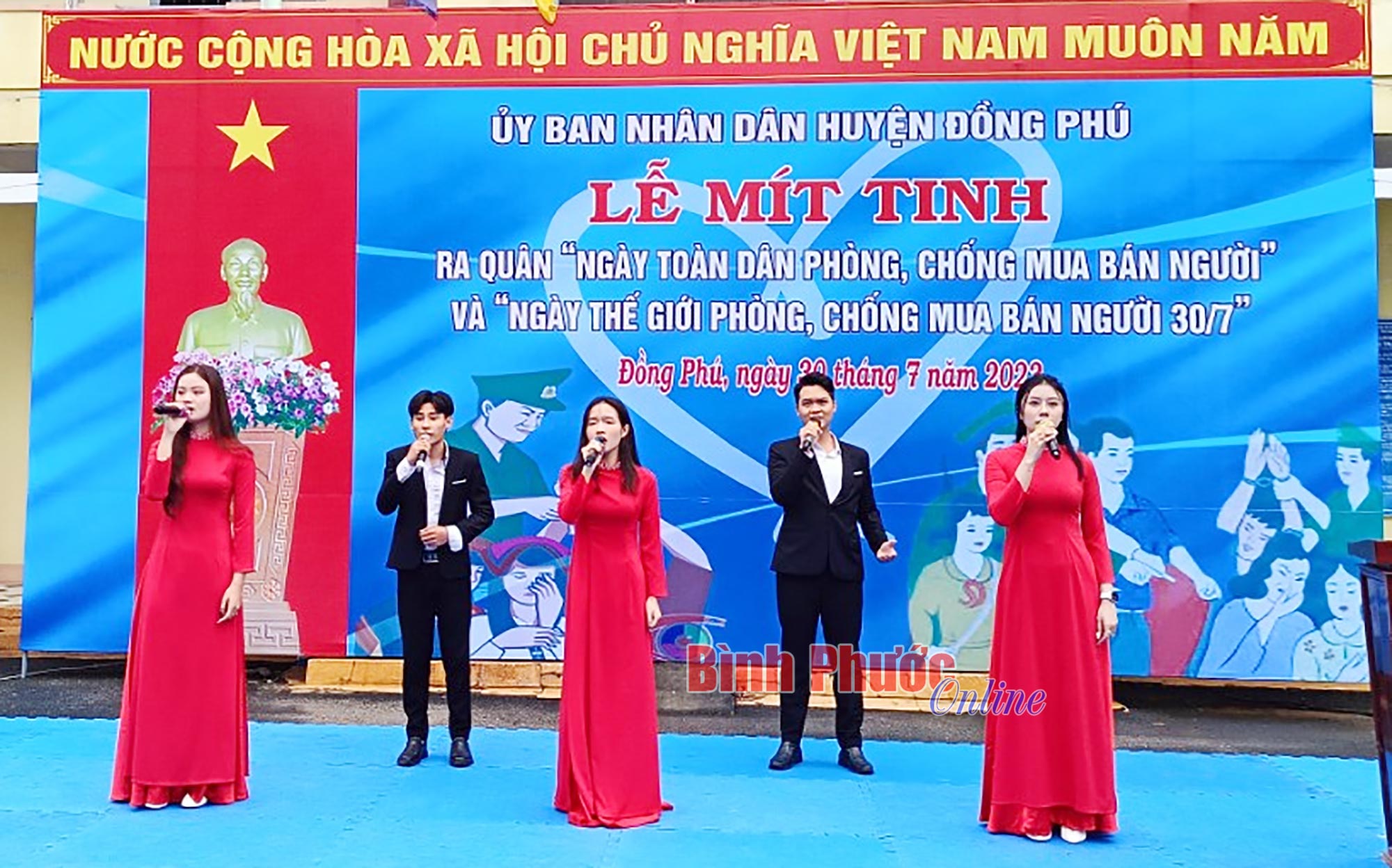 * Cũng trong sáng nay 30-7, UBND huyện Đồng Phú tổ chức lễ mít tinh “Ngày toàn dân phòng, chống mua bán người” và “Ngày thế giới phòng, chống mua bán người 30-7”. Đông đảo cán bộ, công chức, viên chức, lực lượng vũ trang, đoàn viên thanh niên và học sinh trong huyện dự lễ.