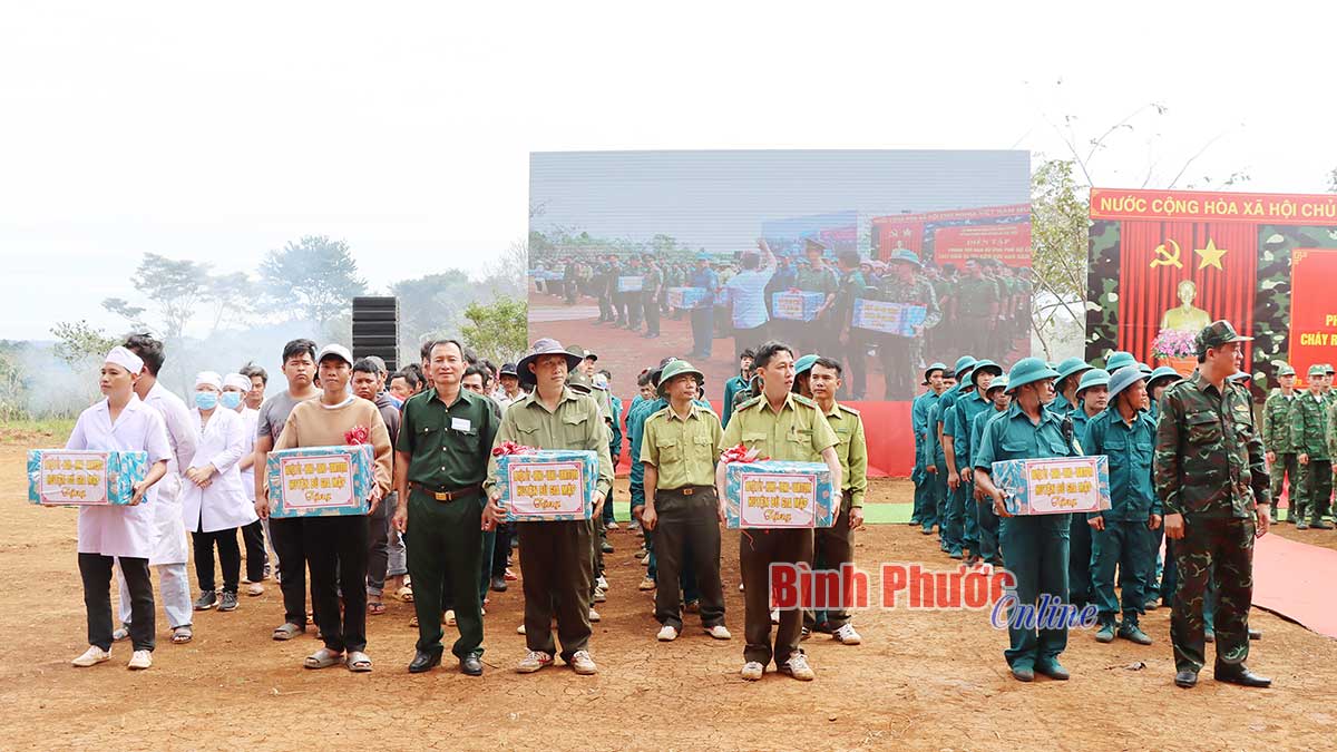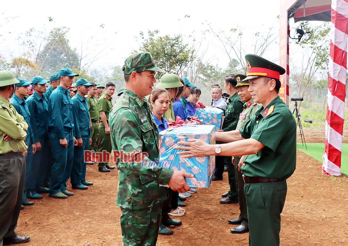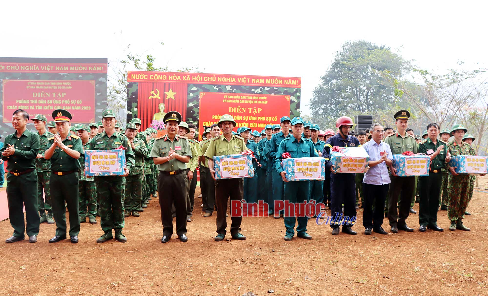 Thường trực Ban Chỉ đạo phòng thủ dân sự tỉnh, huyện Bù Gia Mập tặng quà động viên tinh thần của lực lượng diễn tập