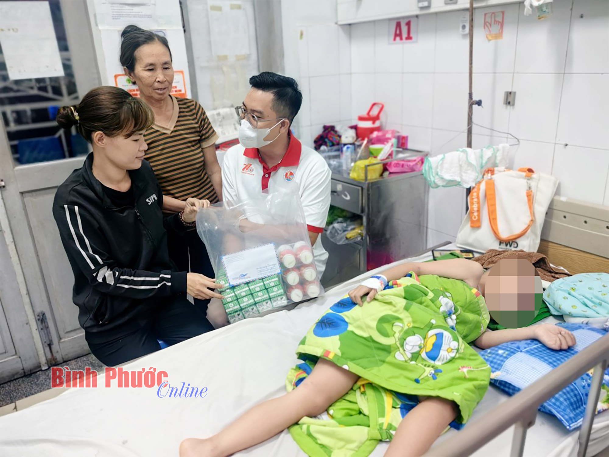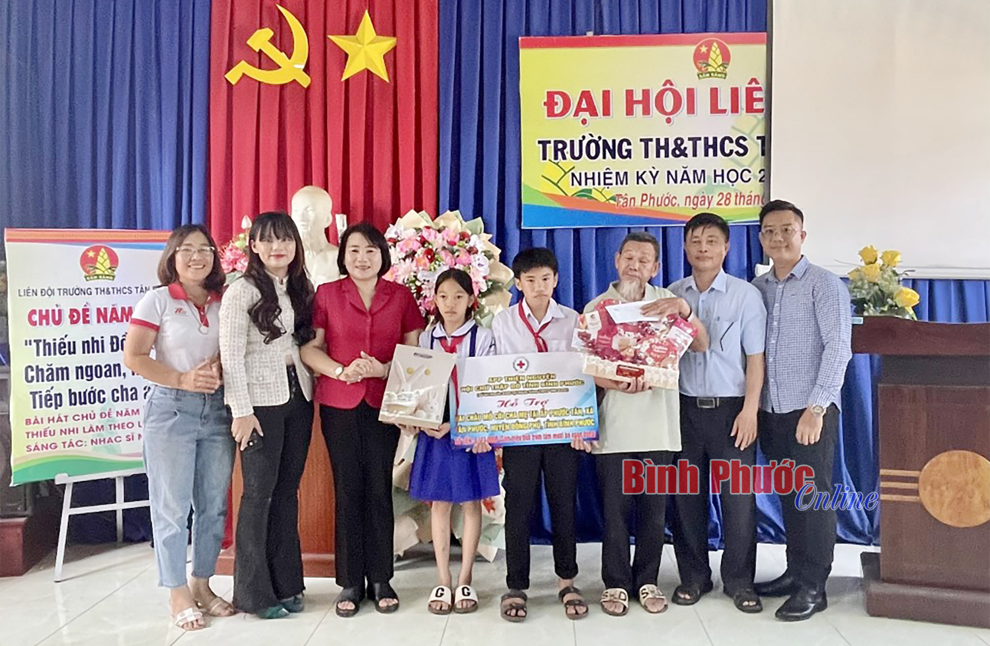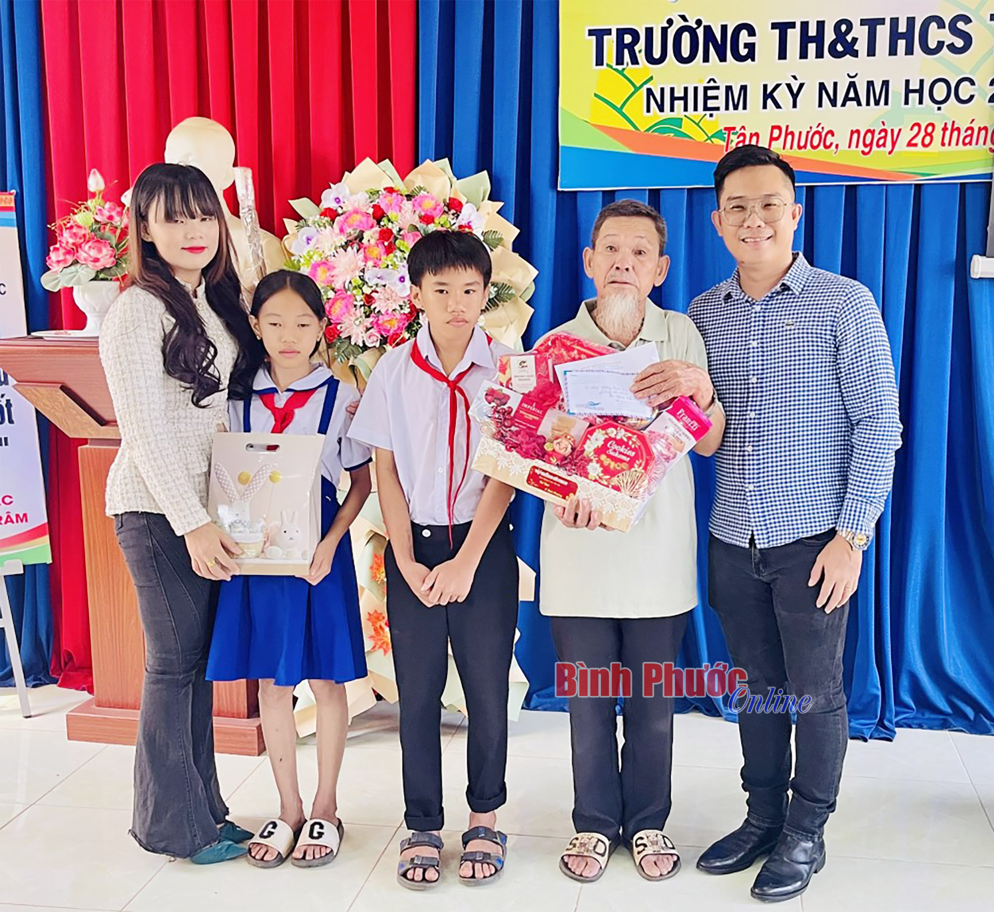 Điểm đến đầu tiên là Trường TH-THCS Tân Phước (huyện Đồng Phú), Hội chữ thập đỏ tỉnh đã trao hơn 8,5 triệu đồng cho hai anh em mồ côi là Nghiệp Thế Thời, học sinh lớp 8A3 và Nghiệp Thị Bích Phượng, học sinh lớp 5A2. Đây là nhân vật của chương trình "Chắp cánh ước mơ" (BPTV) đã được App thiện nguyện của Hội chữ thập đỏ tỉnh chung tay kêu gọi hỗ trợ (chiến dịch 45 ngày). Tham dự cùng đoàn, gia đình chị Phan Thị Yến Ngọc, ở quận 5, TP. Hồ Chí Minh đã hỗ trợ thêm 2 triệu đồng, giúp hai anh em Thời và Phượng có một cái tết đủ đầy hơn.