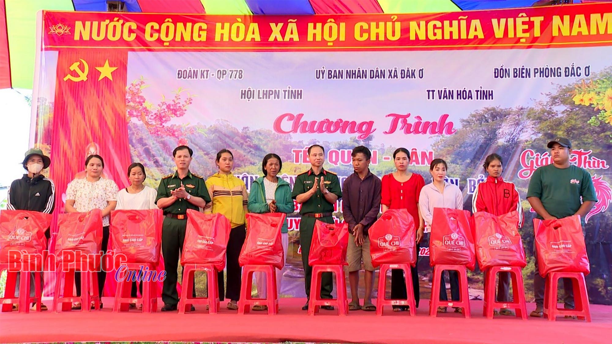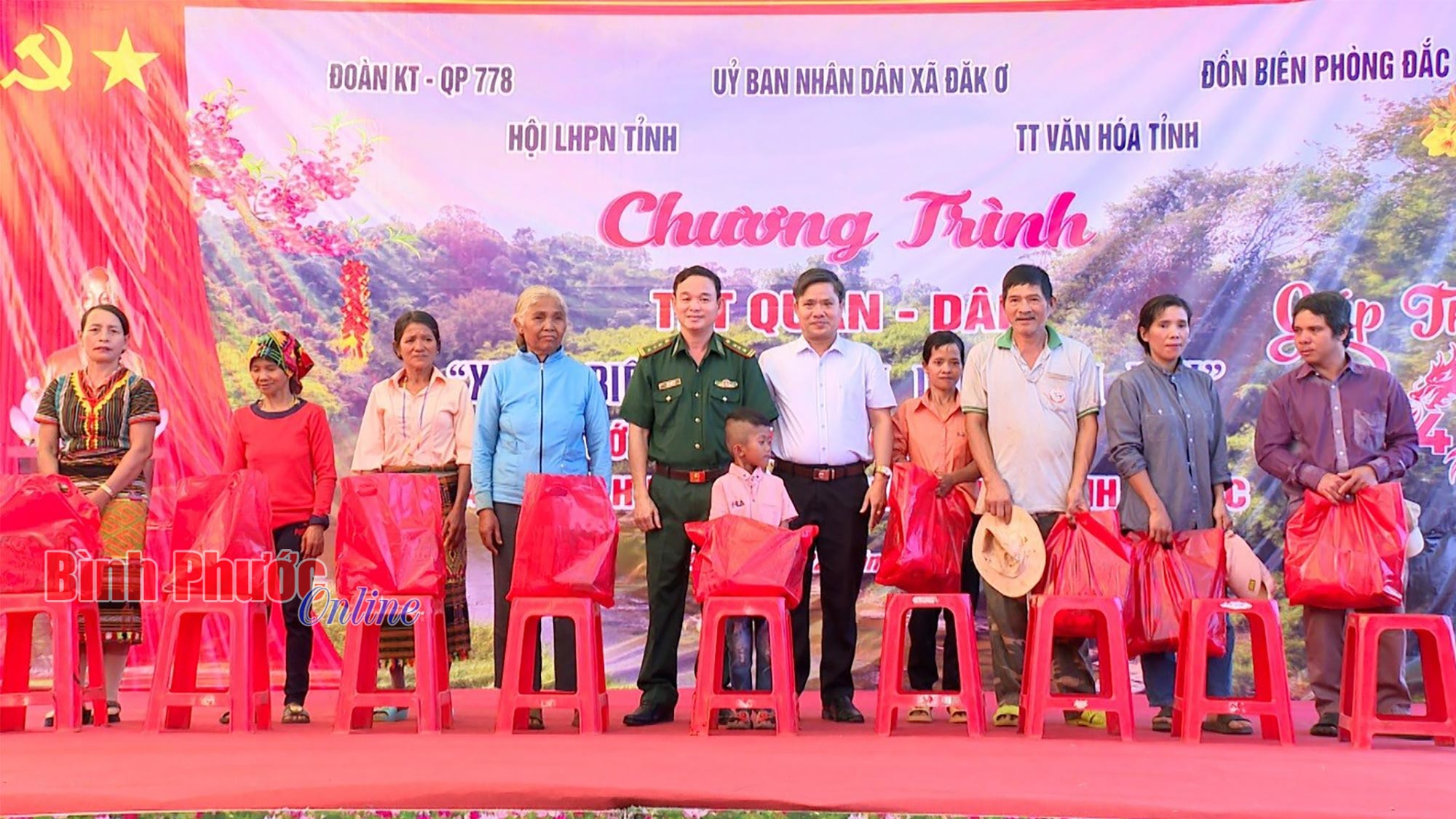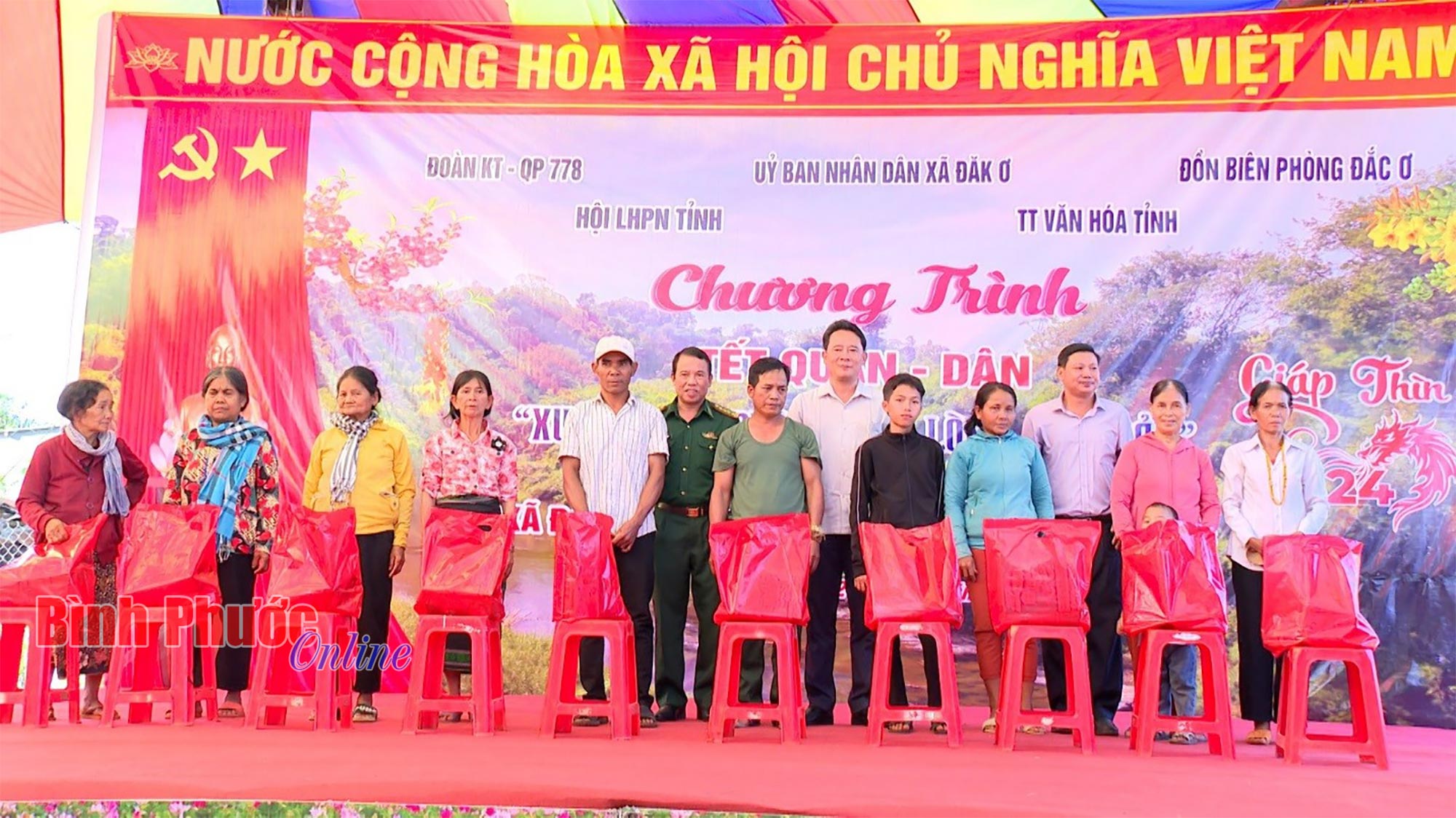 Trong chuỗi hoạt động tết quân - dân “Xuân biên phòng ấm lòng dân bản”, Đoàn Kinh tế - quốc phòng 778, Đồn biên phòng Đắk Ơ đã vận động được trên 750 phần quà tặng các hộ gia đình khó khăn trên địa bàn toàn xã. Tại chương trình đã trao 50 phần quà, mỗi phần trị giá 500 ngàn đồng, cho các hộ gia đình có hoàn cảnh khó khăn thuộc thôn 3, xã Đắk Ơ. Đồng hành cùng chương trình, mạnh thường quân tại địa phương cũng trao 15 phần quà cho các hộ gia đình chính sách.