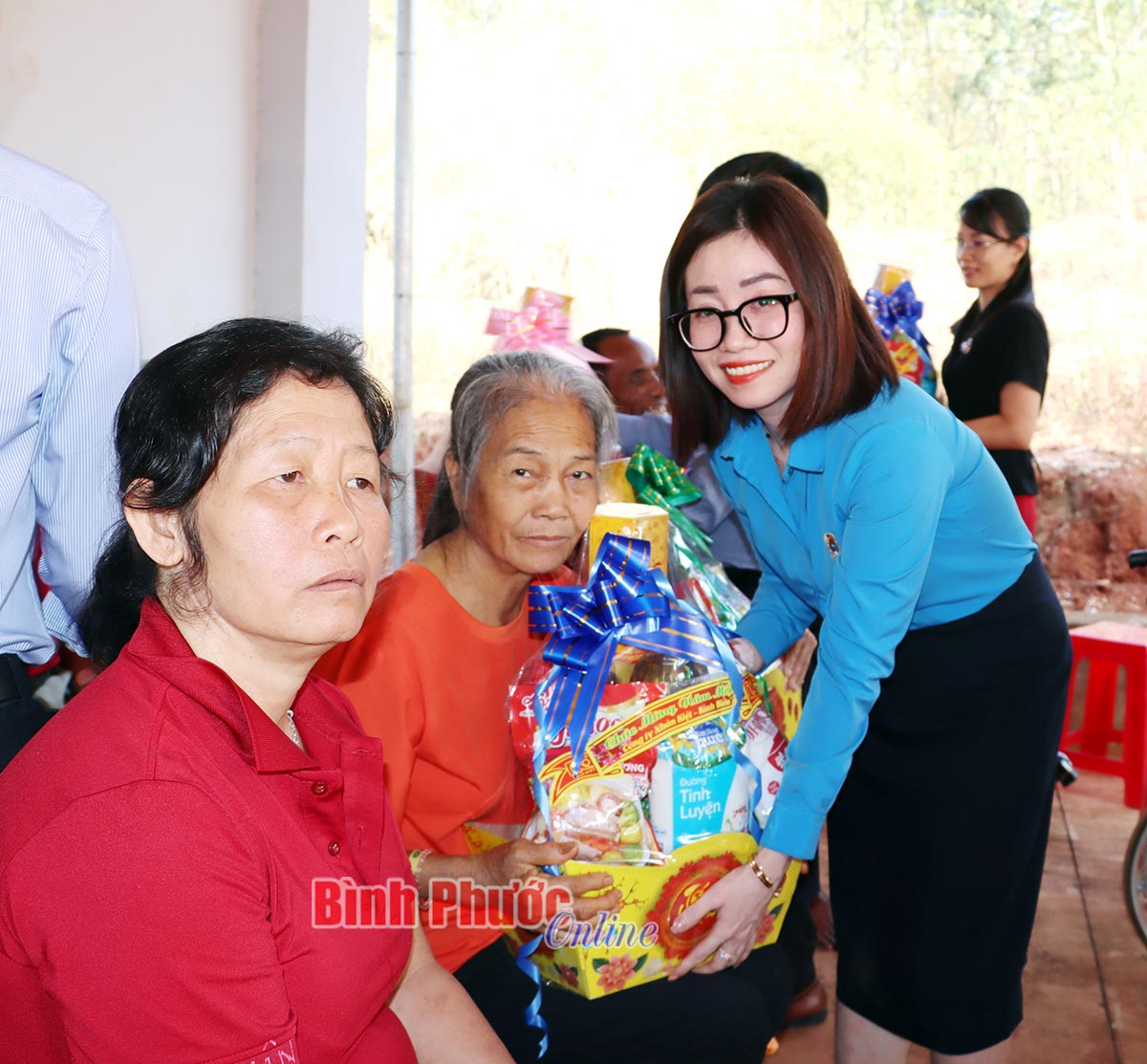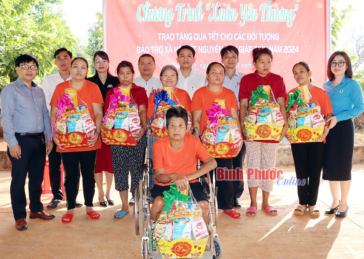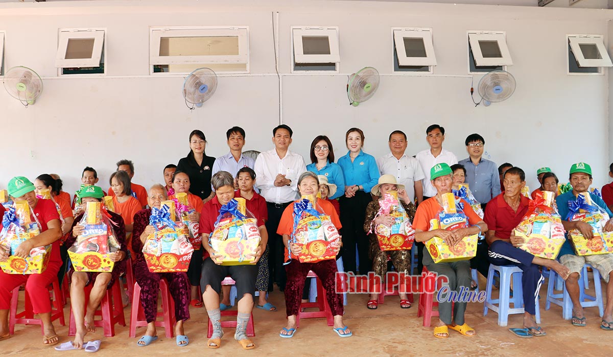 Tại Trung tâm Bảo trợ xã hội tỉnh, đoàn phối hợp với Công đoàn Công ty TNHH MTV Cao su Lộc Ninh, Công ty Cung ứng nhân lực Nhân Kiệt tỉnh Bình Dương trao tặng 75 phần quà cho các đối tượng thuộc diện bảo trợ xã hội đang sống và học tập tại trung tâm, mỗi phần trị giá 500 ngàn đồng.