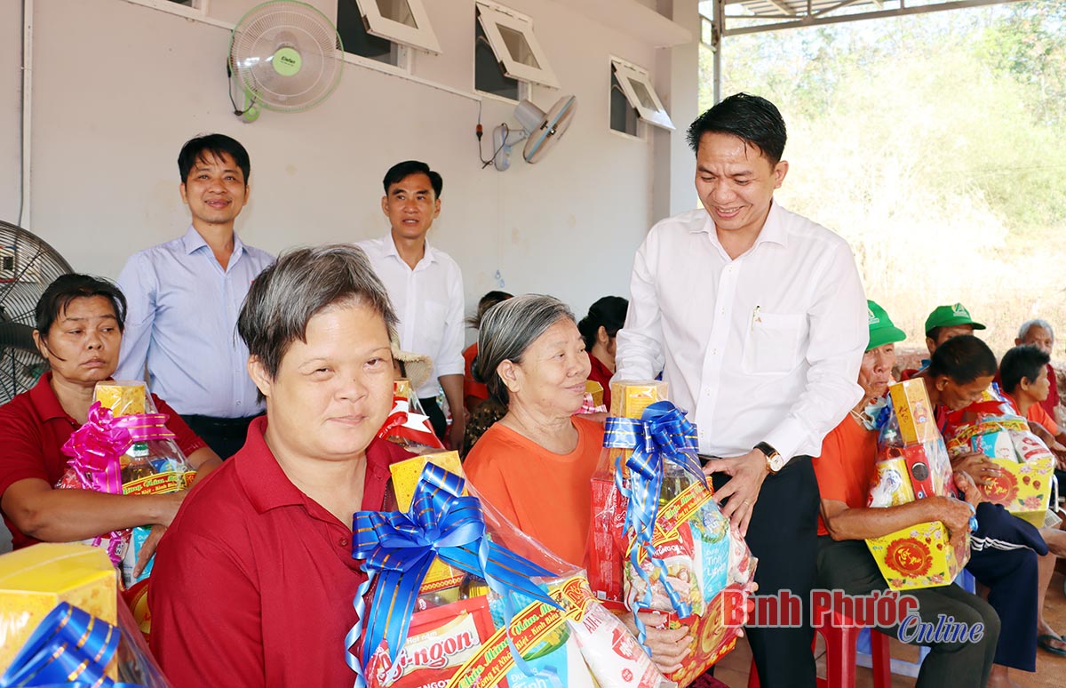 Phó Giám đốc Sở LĐ-TB&XH tỉnh Mai Xuân Tuân, Công đoàn sở, cùng các nhà tài trợ trao quà cho các đối tượng bảo trợ xã hội tại Trung tâm Bảo trợ xã hội tỉnh Bình Phước