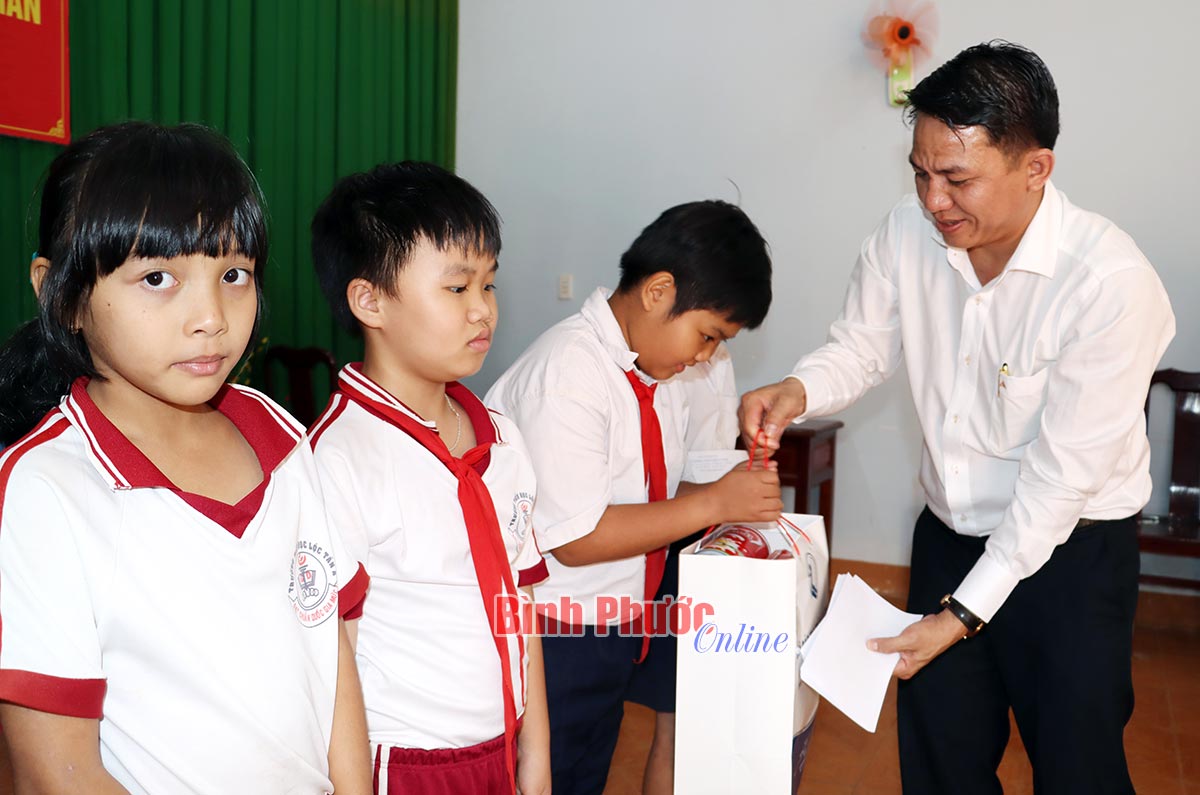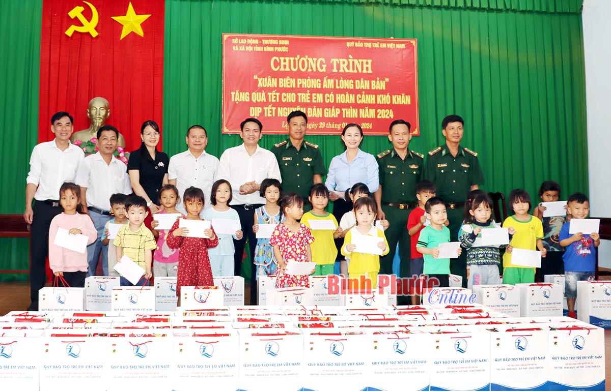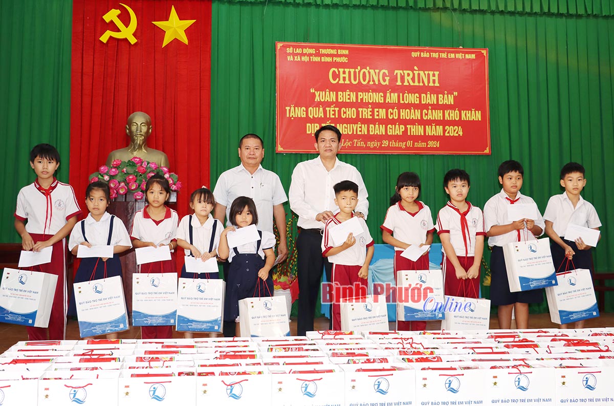 Cũng trong buổi sáng, nằm trong chương trình “Xuân biên phòng ấm lòng dân bản”, đoàn đã phối hợp với Đồn biên phòng Lộc Tấn trao tặng 100 phần quà cho trẻ em có hoàn cảnh đặc biệt khó khăn tại xã Lộc Tấn, mỗi phần trị giá 500 ngàn đồng. Số quà này do Quỹ bảo trợ trẻ em Việt Nam tài trợ.