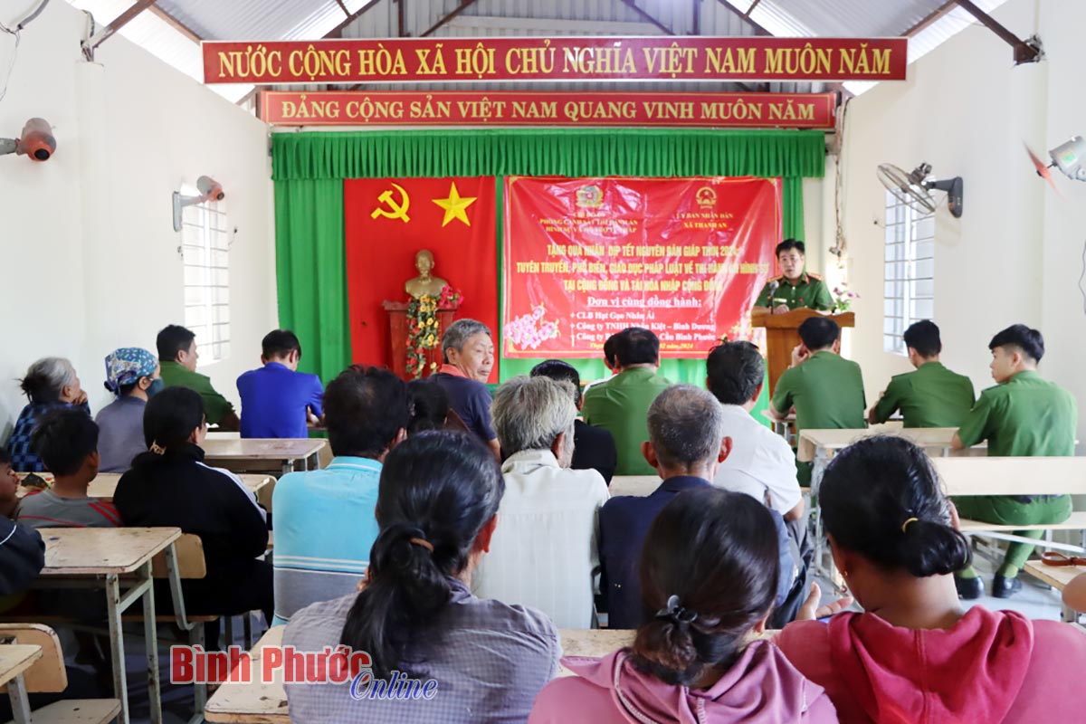 Cũng tại buổi tuyên truyền, Phòng Cảnh sát Thi hành án hình sự và Hỗ trợ tư pháp, Công an tỉnh Bình Phước phối hợp Câu lạc bộ "Hạt gạo nhân ái", Công ty TNHH Nhân Kiệt - Bình Dương; Công ty bảo hiểm Toàn cầu Bình Phước trao 40 phần quà Tết (400 ngàn đồng/phần) cho người dân có hoàn cảnh khó khăn tại ấp Bù Dinh. Những phần quà ý nghĩa được trao tặng sẽ góp thêm điều kiện để người dân vui Xuân đón Tết.