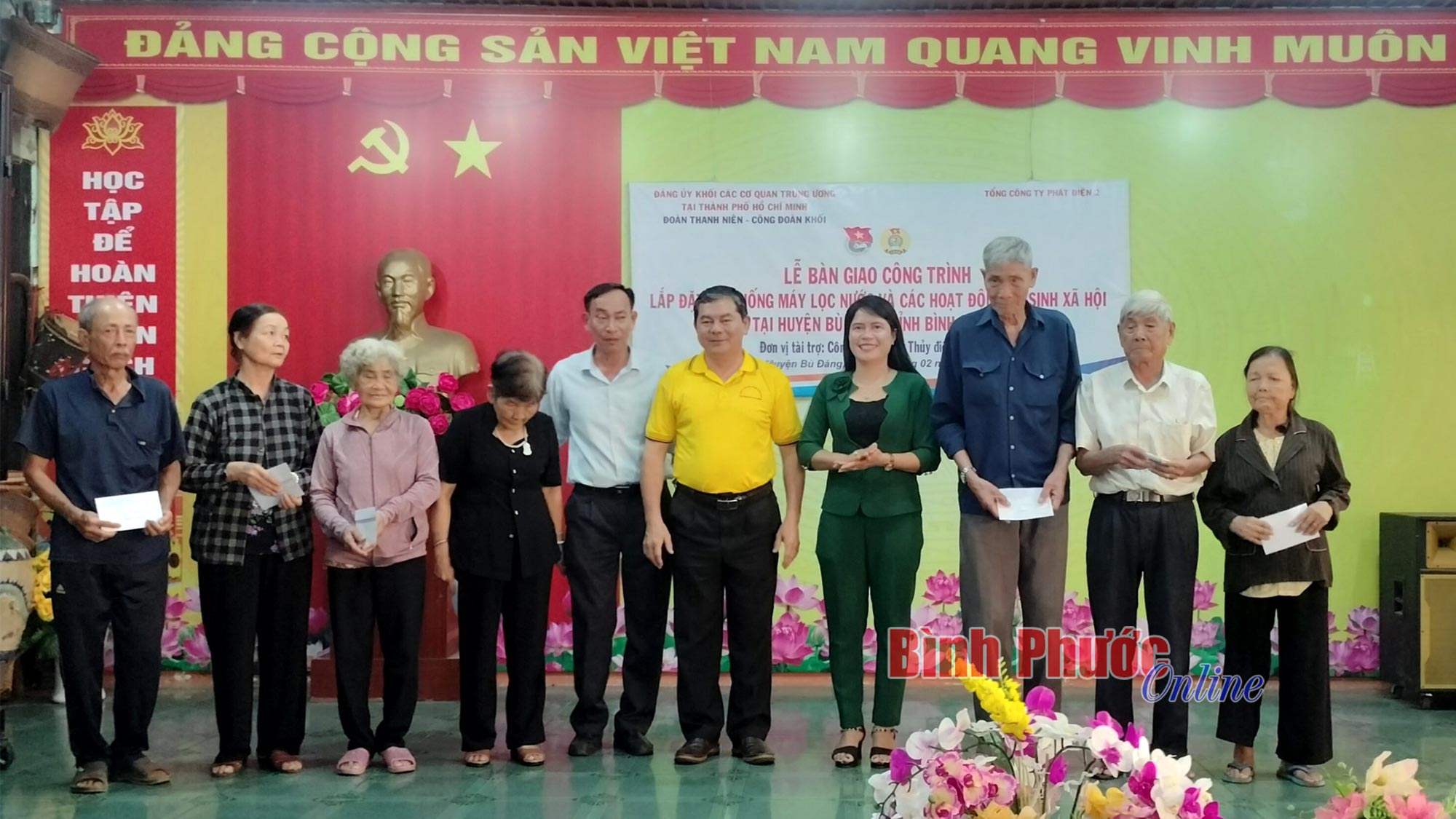 Đại diện lãnh đạo Đảng ủy Khối các cơ quan Trung ương tại TP. Hồ Chí Minh, Công ty Cổ phần Thủy điện Thác Mơ và lãnh đạo huyện Bù Đăng tặng quà cho các gia đình thương binh nặng trên địa bàn huyện