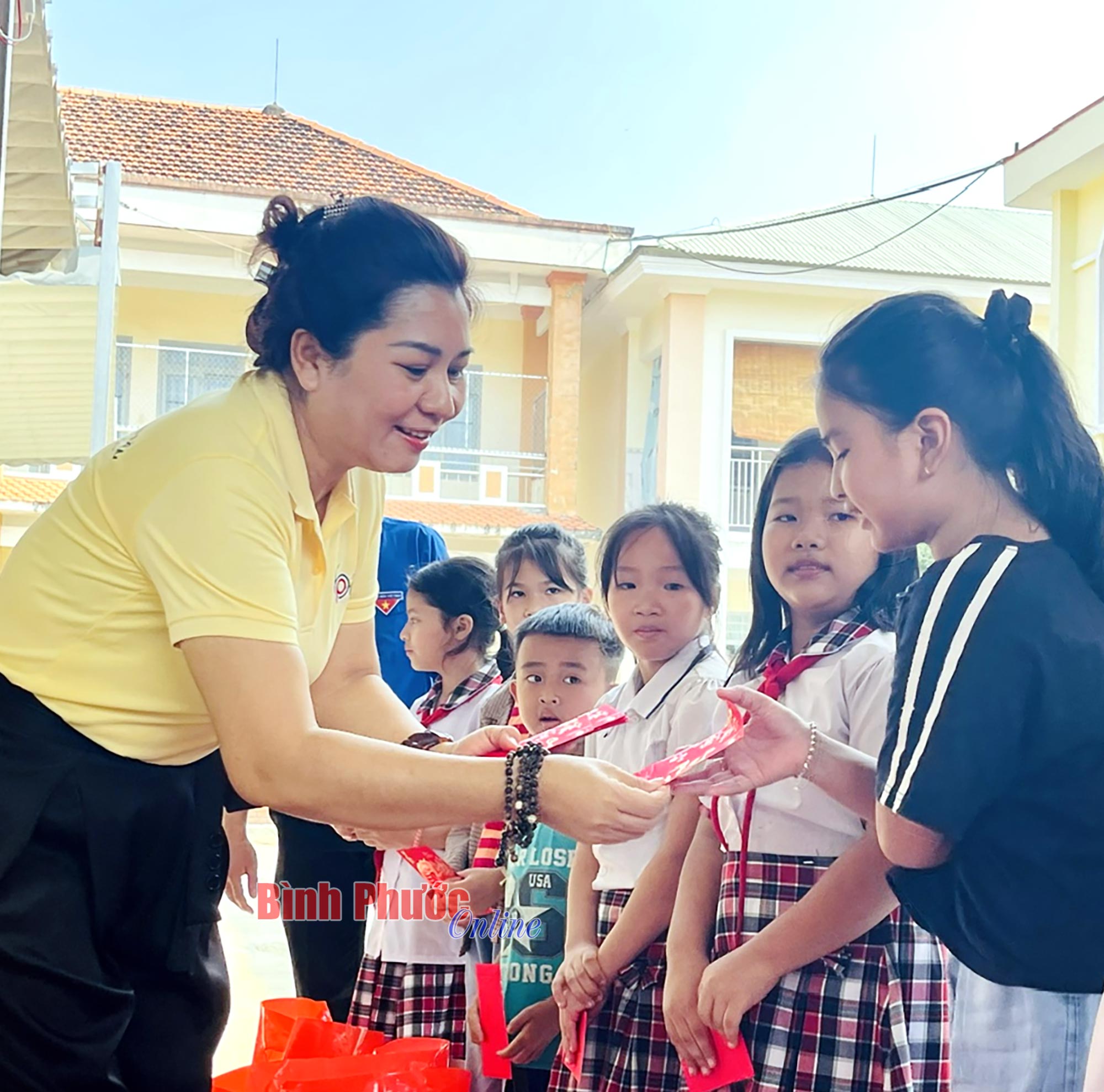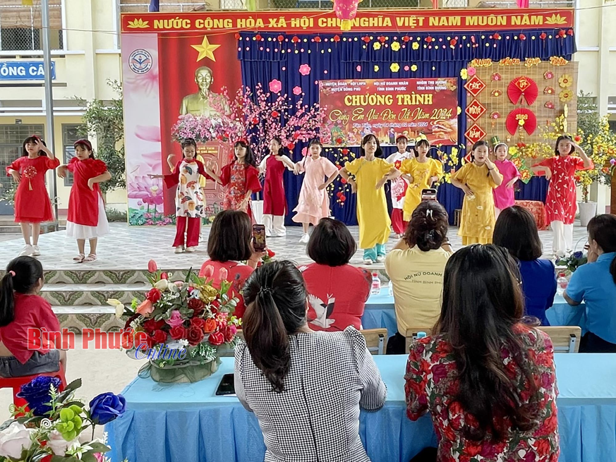 Tại Trường tiểu học Tân Tiến, Hội Nữ doanh nhân tỉnh phối hợp Huyện đoàn và Hội Liên hiệp Phụ nữ huyện Đồng Phú tổ chức chương trình “Cùng em vui đón tết năm 2024”. Hòa chung không khí vui tươi với những tiết mục văn nghệ đặc sắc, 100 trẻ em hoàn cảnh đặc biệt khó khăn khó khăn, trẻ mồ côi đã được đón nhận quà tặng từ chương trình. Mỗi phần quà trị giá 400 ngàn đồng. Trong đó gồm 1 bao lì xì tiền mặt 200 ngàn đồng và bánh, kẹo mứt tết. Toàn bộ số quà được vận động từ nhóm thiện nguyện Thu Hương ở tỉnh Bình Dương.