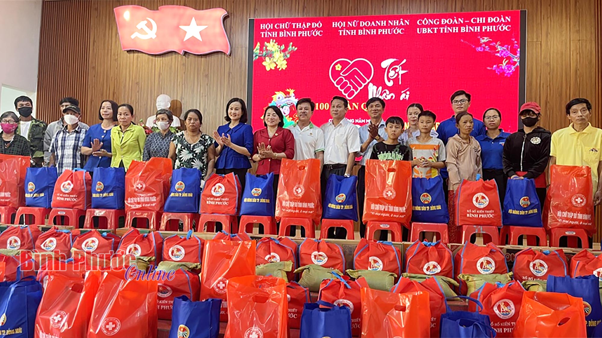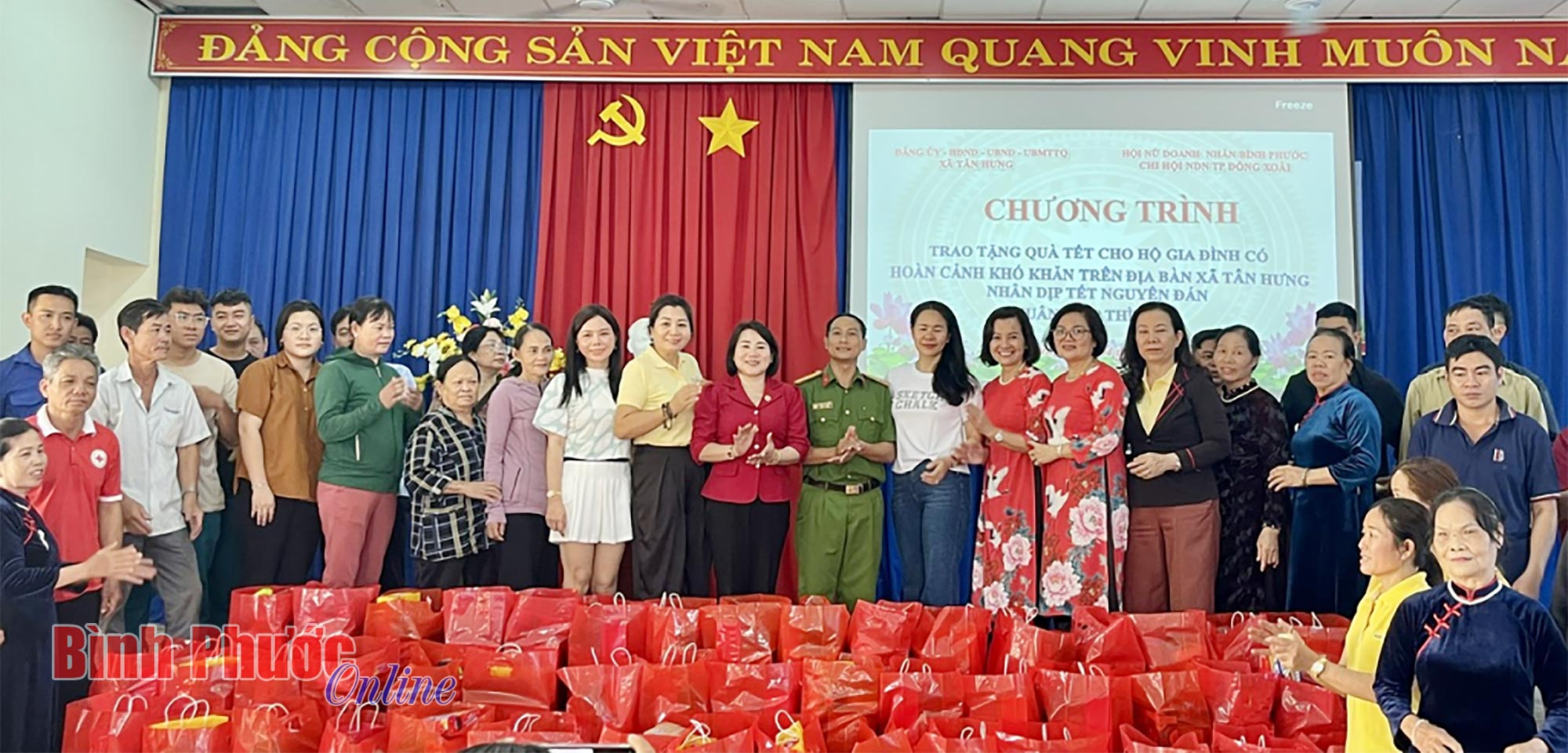 Đến với chương trình "Tết nhân ái" tại xã Tân Lập, Hội Nữ doanh nhân tỉnh phối hợp Hội Chữ thập đỏ tỉnh và Công đoàn - Chi đoàn Ủy ban Kiểm tra Tỉnh ủy Bình Phước trao 100 phần quà tặng các hộ gia đình hoàn cảnh khó khăn. Mỗi phần quà là 1 túi nhu yếu phẩm thiết yếu và 1 chiếc mền, trị giá 500 ngàn đồng/phần.