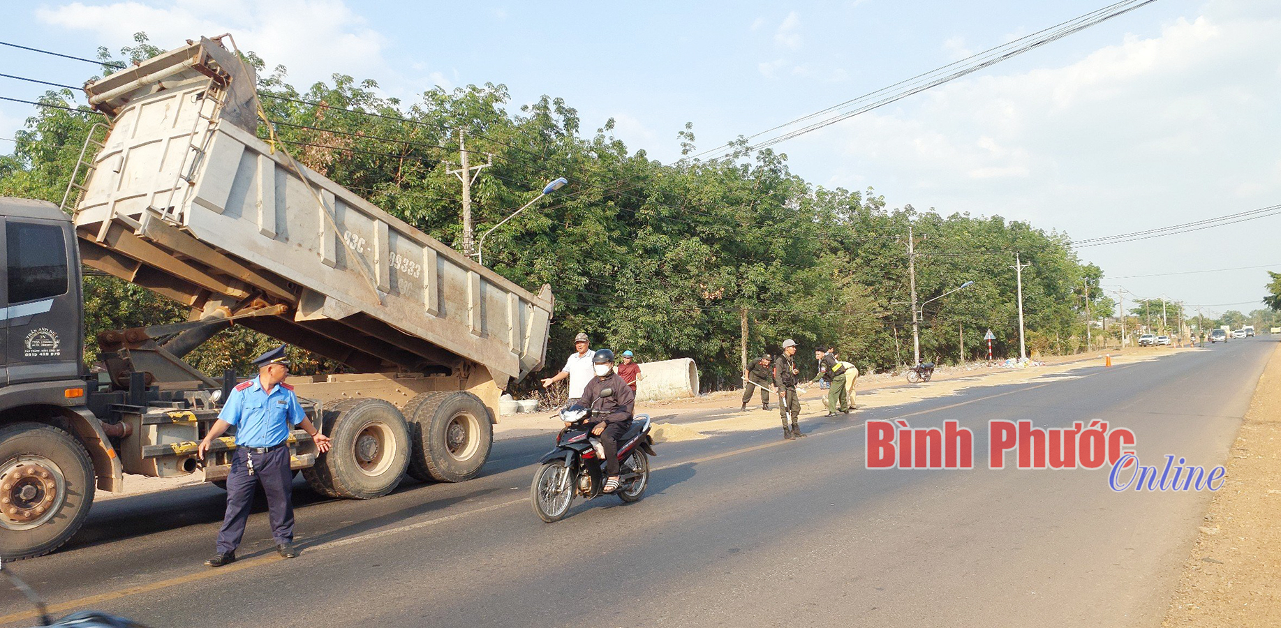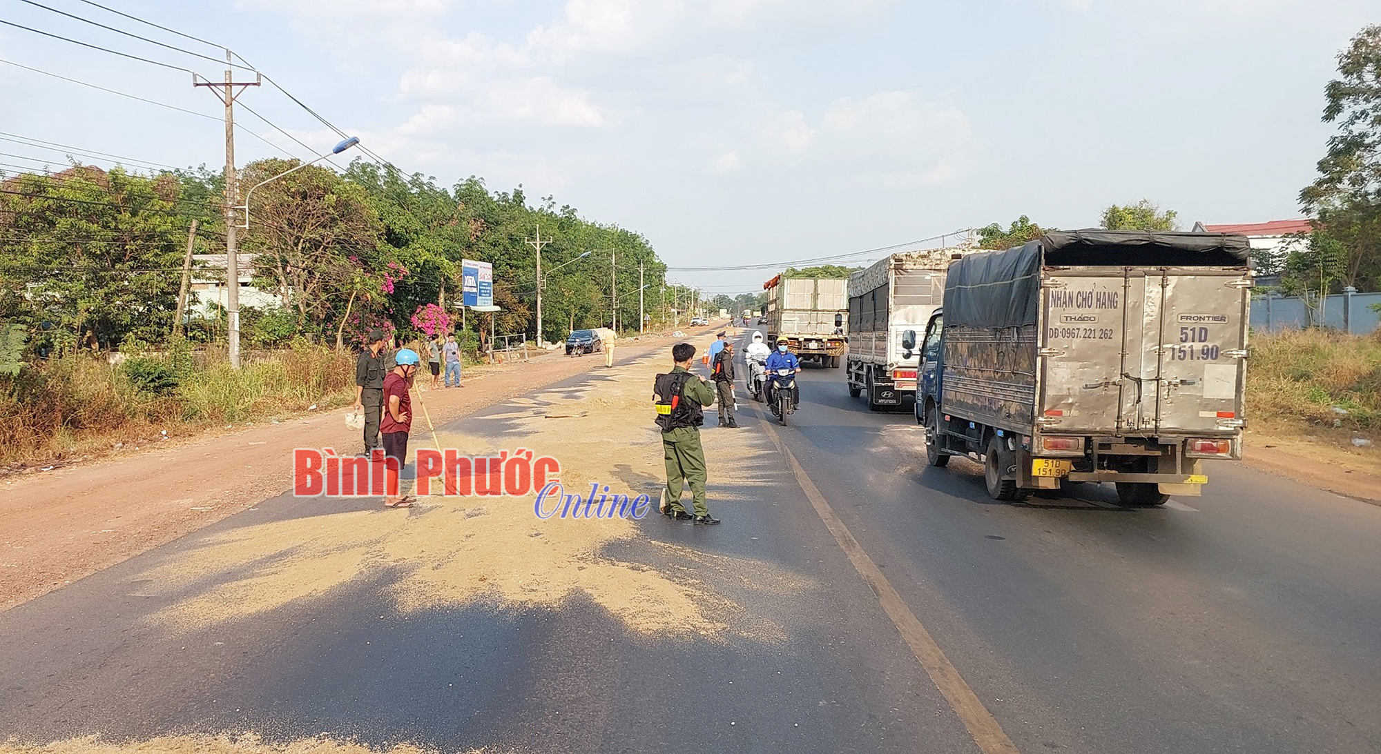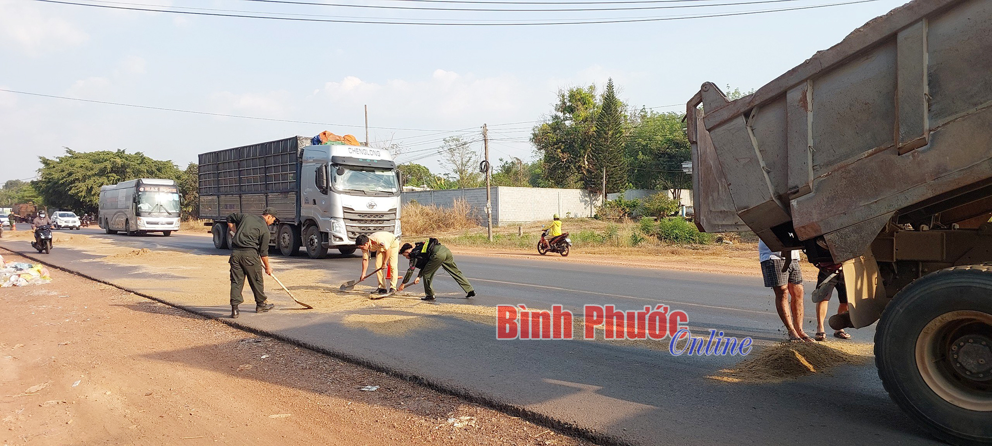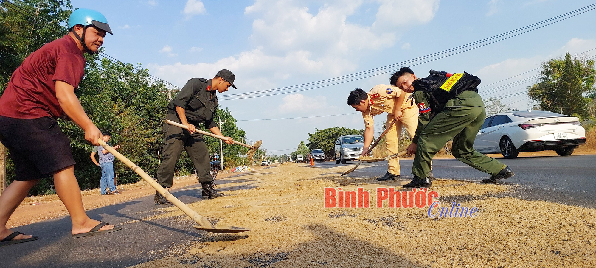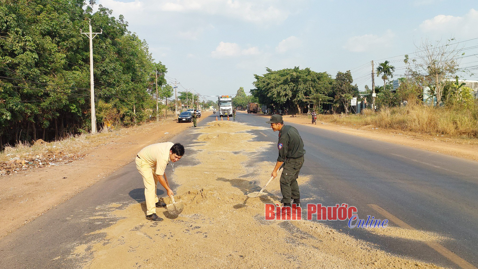 Đoạn đường bị trơn trượt có chiều dài khoảng 1km, phía bên phải quốc lộ 14, hướng Đồng Xoài - Chơn Thành. Chỉ huy Trạm CSGT Đồng Phú đã nhanh chóng vận động doanh nghiệp hỗ trợ khoảng 10m3 cát rải lên mặt đường chống trơn. Đội Thanh tra số 1, Sở Giao thông vận tải tỉnh cũng kịp thời có mặt phối hợp điều tiết phương tiện chống ùn tắc giao thông. Một số người dân xã Tân Thành và đội thanh niên xung kích 193 Đồng Xoài cũng đã có mặt kịp thời, nhiệt tình phối hợp hỗ trợ lực lượng chức năng giải quyết vụ việc. Sau khoảng 1 giờ, sự cố trơn trượt đã được khắc phục, tình hình trật tự an toàn giao thông đảm bảo thông suốt.