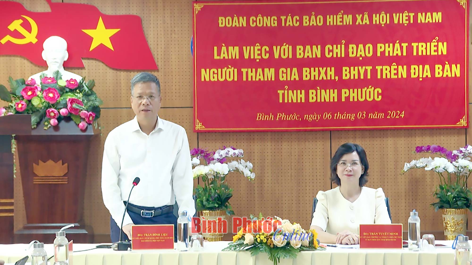 Phát biểu kết luận buổi làm việc, Phó Tổng giám đốc BHXH Việt Nam Trần Đình Liệu ghi nhận, đánh giá cao kết quả thực hiện chính sách BHXH, BHYT của tỉnh Bình Phước trong năm 2023 vừa qua. Với dư địa người tham gia BHXH, BHYT còn rất lớn, Bình Phước cần tiếp tục kiện toàn, bổ sung Ban Chỉ đạo phát triển người tham gia BHXH, BHYT ở cơ sở, tăng cường tuyên truyền, nâng cao nhận thức của người dân về chính sách nhân văn của BHXH, BHYT. Đặc biệt chú trọng đầu tư, nâng cao chất lượng khám chữa bệnh, đẩy mạnh chuyển đổi số gắn với cải cách thủ tục hành chính trong thanh toán, chi trả, qua đó thu hút ngày càng nhiều đối tượng tham gia BHXH, BHYT thời gian tới.