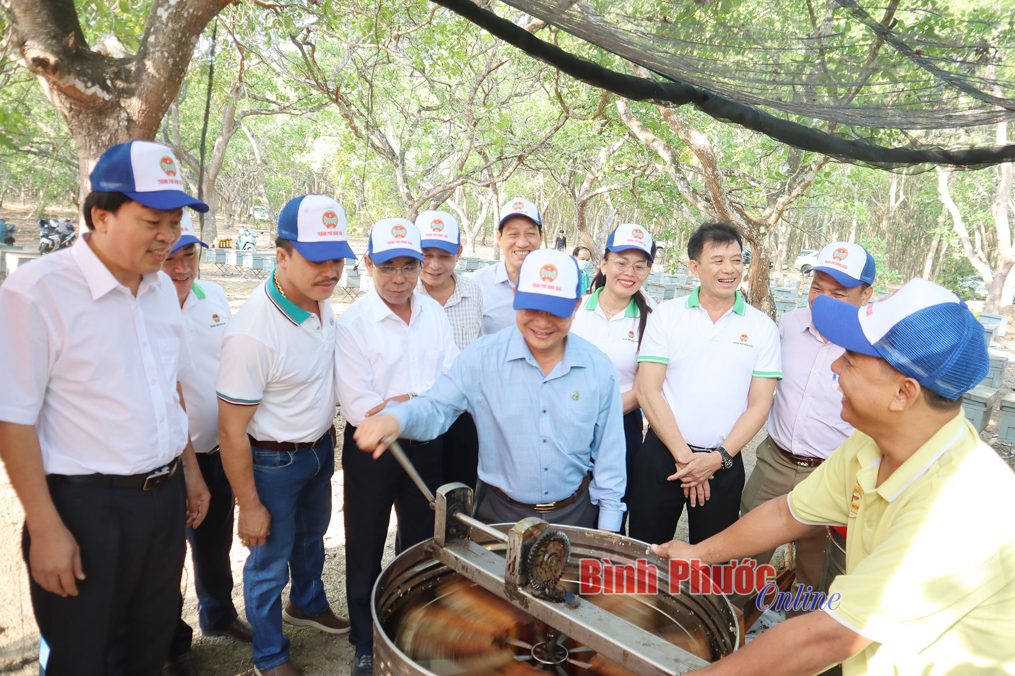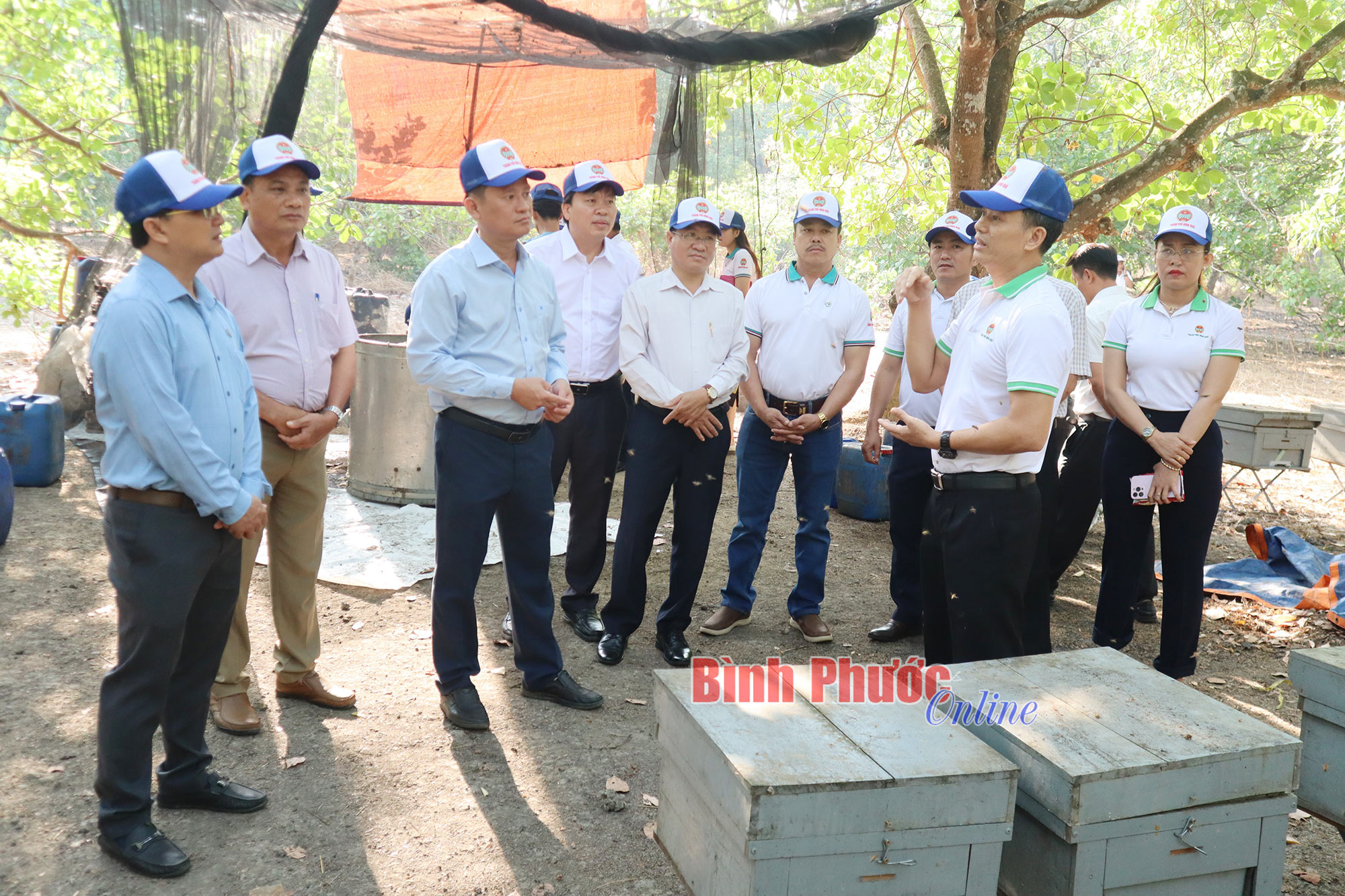 Đoàn đã tham quan khu vực nuôi ong của Công ty TNHH Mật ong Sông Bé (khu phố 3, phường Tiến Thành) và trực tiếp quan sát, trải nghiệm các quy trình, công đoạn khai thác mật ong. Giám đốc công ty Vũ Tiến Hoàng cho biết ngoài việc trực tiếp nuôi ong lấy mật, công ty còn thu mua mật ong của các hộ nuôi ong trên địa bàn thành phố và trong tỉnh để chế biến thành mật ong thương phẩm bán trong nước và xuất khẩu.