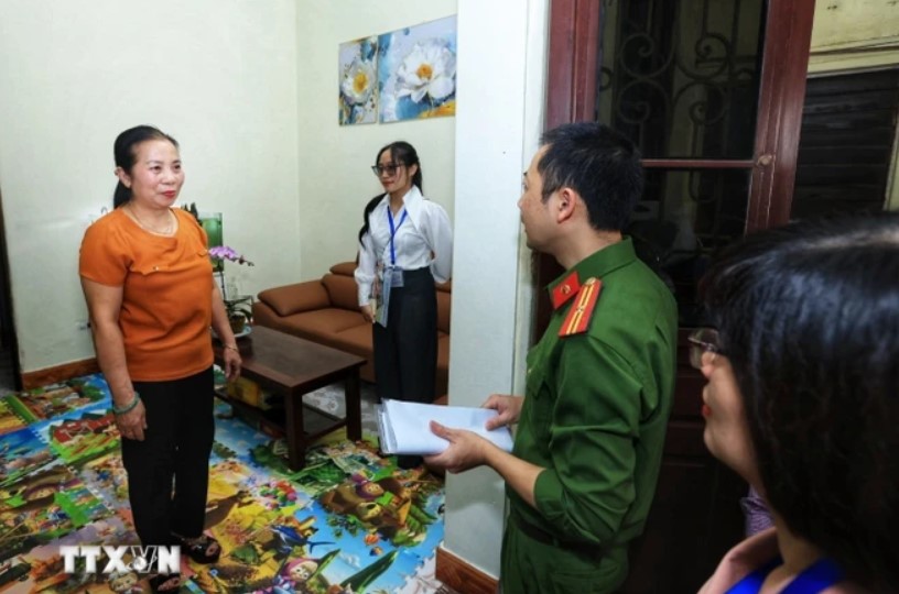 Các điều tra viên kiểm tra thông tin hộ bà Nguyễn Thị Nhung, số 14, ngõ 698, Lạc Long Quân, Phường Nhật Tân, quận Tây Hồ. (Ảnh: Tuấn Anh/TTXVN)