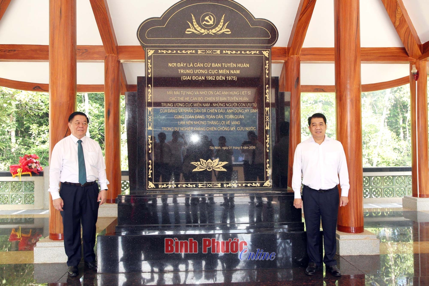 Ủy viên Bộ Chính trị, Trưởng ban Tuyên giáo Trung ương Nguyễn Trọng Nghĩa và Chủ tịch HĐQT Tập đoàn Hùng Nhơn Vũ Mạnh Hùng chụp ảnh lưu niệm tại Khu Di tích lịch sử quốc gia Ban Tuyên huấn Trung ương Cục miền Nam