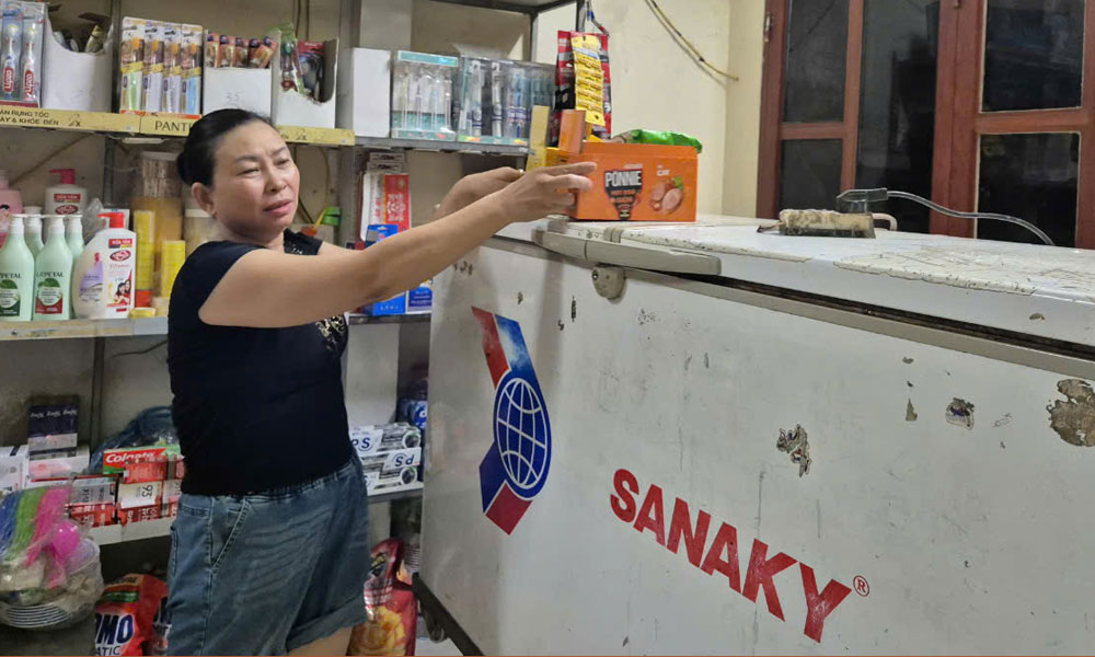 | Chị Nguyễn Thị Phương, tiểu thương kinh doanh ở chợ Mỹ Độ kê dọn tài sản lên vị trí cao hơn. |