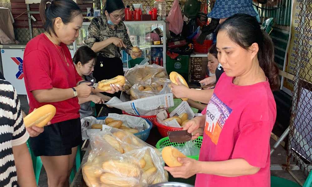 | Phụ nữ xã Đồng Sơn chuẩn bị bánh mỳ cho cán bộ, chiến sĩ ăn tạm bữa tối. |
