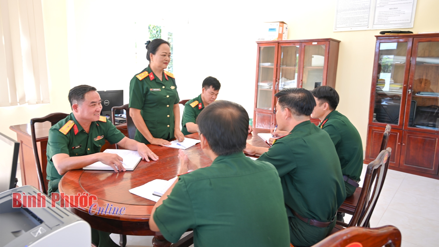 Thiếu tá quân nhân chuyên nghiệp Nguyễn Thị Bích Vân phát biểu ý kiến tại buổi họp của bộ phận hậu cần Ban CHQS huyện Đồng Phú