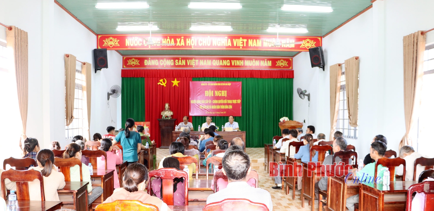Hội trường thôn Đắk Côn, xã Bù Gia Mập, huyện Bù Gia Mập được xây dựng mới hơn 100 chỗ ngồi nhưng vẫn không đáp ứng đủ khi địa phương tổ chức hội nghị đối thoại giữa người đứng đầu cấp ủy, chính quyền, MTTQ với cán bộ, nhân dân thôn. Bí thư Đảng ủy xã Phạm Sỹ Hoàn cho biết: Hội nghị đối thoại trực tiếp được địa phương tổ chức nghiêm túc, trách nhiệm từ năm 2019 đến nay và luân phiên thực hiện tại địa bàn từng thôn với số lượng người tham gia không ngừng tăng theo hằng năm. Đặc biệt, năm nay Bù Gia Mập là xã cuối cùng của tỉnh Bình Phước được đầu tư về đích nông thôn mới nên càng thu hút sự quan tâm của đông đảo cán bộ, đảng viên và nhân dân.