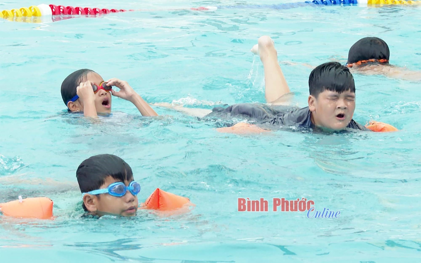 Cho trẻ tham gia các khóa học bơi đang được nhiều bậc phụ huynh lựa chọn. Trong ảnh: Trẻ học bơi ở lớp năng khiếu của Trung tâm Văn hóa - Thể thao thị xã Phước Long - Ảnh: Trương Hiện