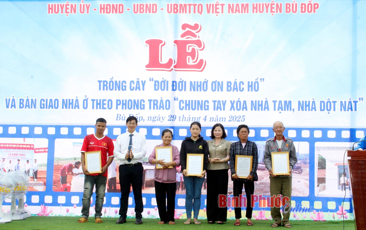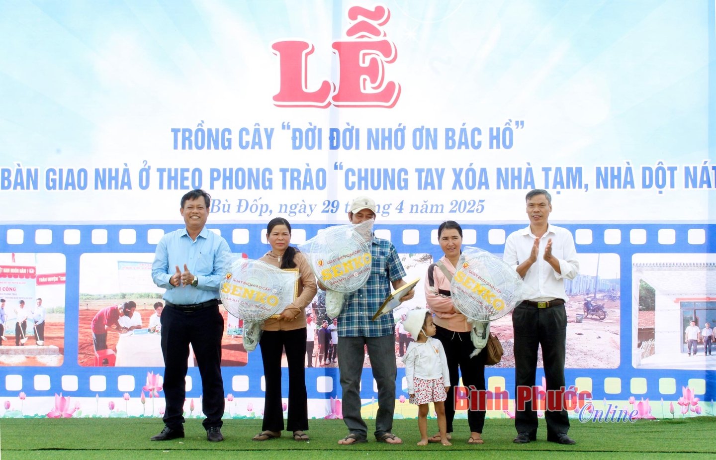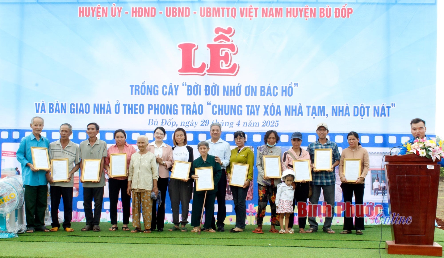 Tại buổi lễ, lãnh đạo huyện Bù Đốp đã trao quyết định bàn giao 17 căn nhà cho các hộ nghèo, cận nghèo thuộc tổ 5, thôn 7, xã Thiện Hưng. Trong chỉ tiêu xóa 102 căn nhà tạm, nhà dột nát của huyện năm 2025, có 17 hộ không có đất xây dựng. Để hỗ trợ các hộ dân, huyện Bù Đốp đã vận động doanh nghiệp hiến đất, Nhà nước hỗ trợ xây dựng nhà với số tiền 80 triệu đồng/căn. Nhờ vậy, khu dân cư mới đã được hình thành và được đầu tư đồng bộ hạ tầng như đường giao thông, điện, hệ thống cấp nước tập trung. Ngoài nhà ở, các hộ còn được tặng thêm quạt, gạo, mì tôm.