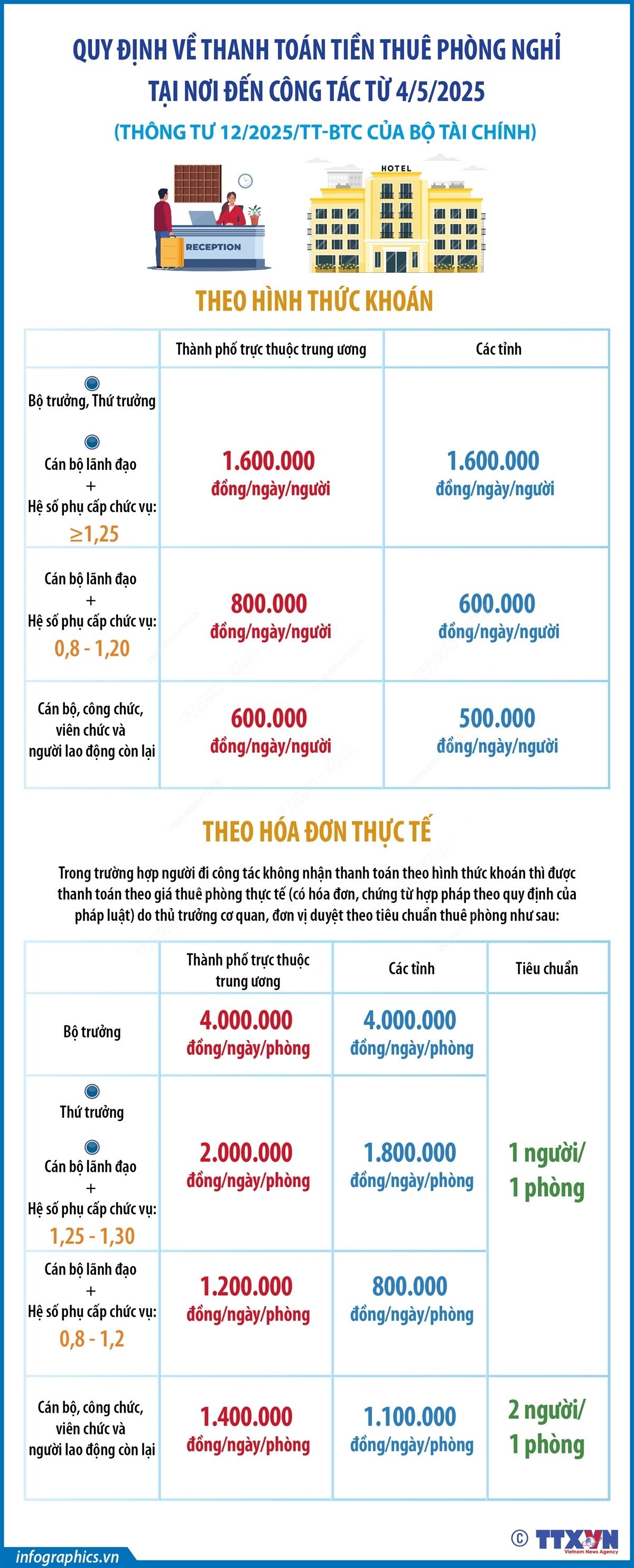 Theo Thông tư 12/2025/TT-BTC ngày 19-3-2025 của Bộ Tài chính, từ 4-5-2025, mức khoán tiền thuê phòng nghỉ tại nơi đến công tác thấp nhất 500.000 đồng/ngày/người, cao nhất là 1.600.000 đồng/ngày/người; mức thanh toán theo hóa đơn thấp nhất là 1.100.000 đồng/ngày/phòng (tiêu chuẩn 2 người 1 phòng), cao nhất là 4.000.000 đồng/ngày/phòng (tiêu chuẩn 1 người 1 phòng), tùy theo đối tượng và nơi đến công tác.