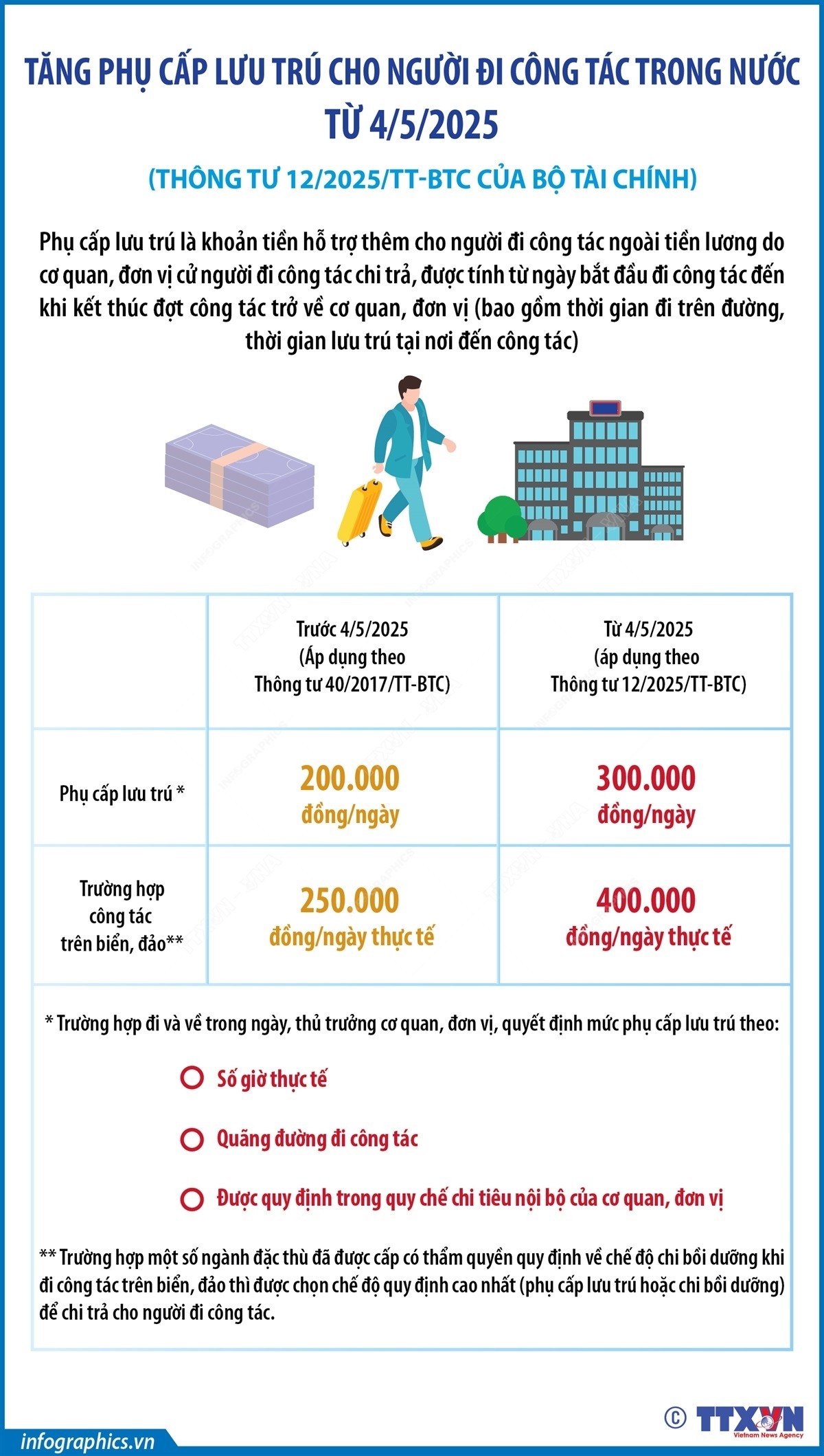 Thông tư 12/2025/TT-BTC ngày 19-3-2025 của Bộ Tài chính cũng quy định từ 4-5-2025, mức phụ cấp lưu trú để chi trả cho người đi công tác tăng từ 200.000 lên 300.000 đồng/ngày.