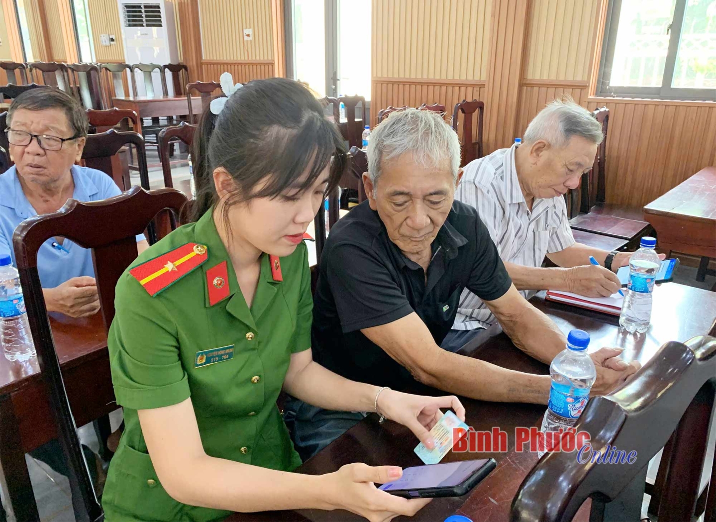 Cán bộ Phòng Quản lý hành chính về trật tự xã hội, Công an tỉnh trực tiếp hướng dẫn người dân cách cài đặt, kích hoạt tài khoản định danh điện tử mức 2 và tích hợp các loại giấy tờ cá nhân vào VneID