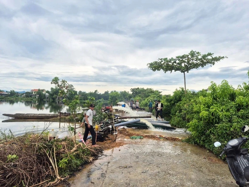Hợp tác xã nông nghiệp Phú Hồ, xã Phú Hồ, huyện Phú Vang, thành phố Huế huy động nhân lực, máy bơm tiêu úng cứu lúa cho nông dân sau đợt mưa lớn do ảnh hưởng của bão số 1 (Ảnh: Tường Vi/TTXVN)