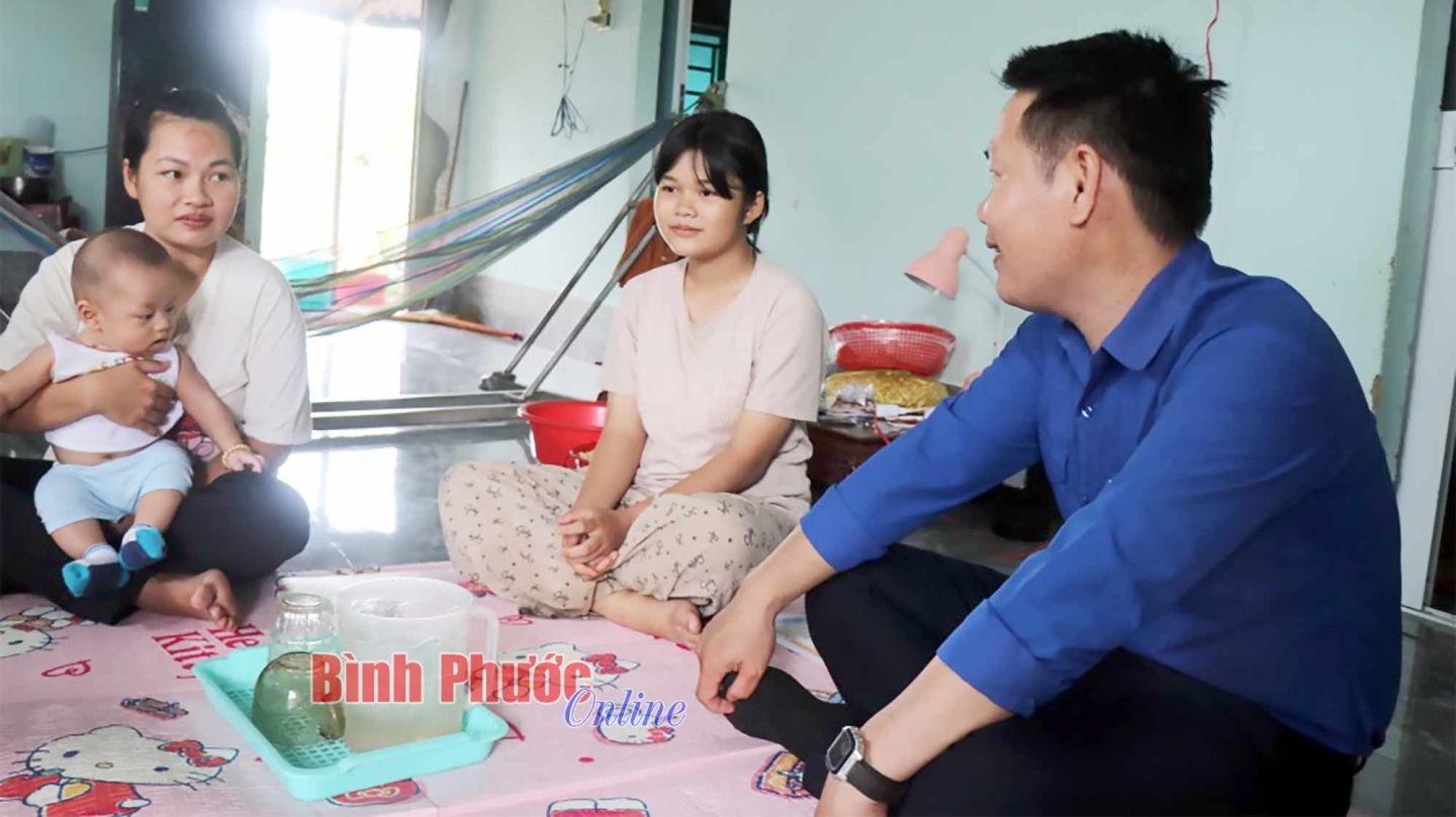 Bên cạnh giáo dục kỹ năng sống, Ban Chỉ đạo hè huyện Bù Ðốp luôn quan tâm, chăm lo trẻ em hoàn cảnh khó khăn. Trong ảnh: Bí thư Huyện đoàn Bù Ðốp Tạ Minh Tâm đến thăm và trao học bổng cho em Dương Ngọc Như Ý ở xã Thanh Hòa