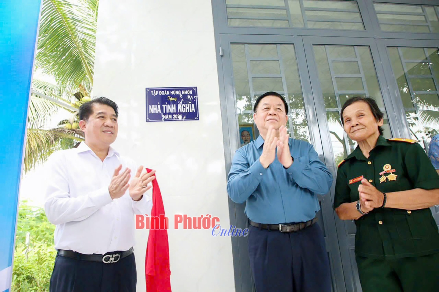 Ủy viên Bộ Chính trị, Bí thư Trung ương Đảng, Trưởng ban Tuyên giáo Trung ương, đại biểu Quốc hội đơn vị tỉnh Tây Ninh Nguyễn Trọng Nghĩa (giữa) và Chủ tịch HĐQT Tập đoàn Hùng Nhơn Vũ Mạnh Hùng tại lễ bàn giao nhà tình nghĩa năm 2024