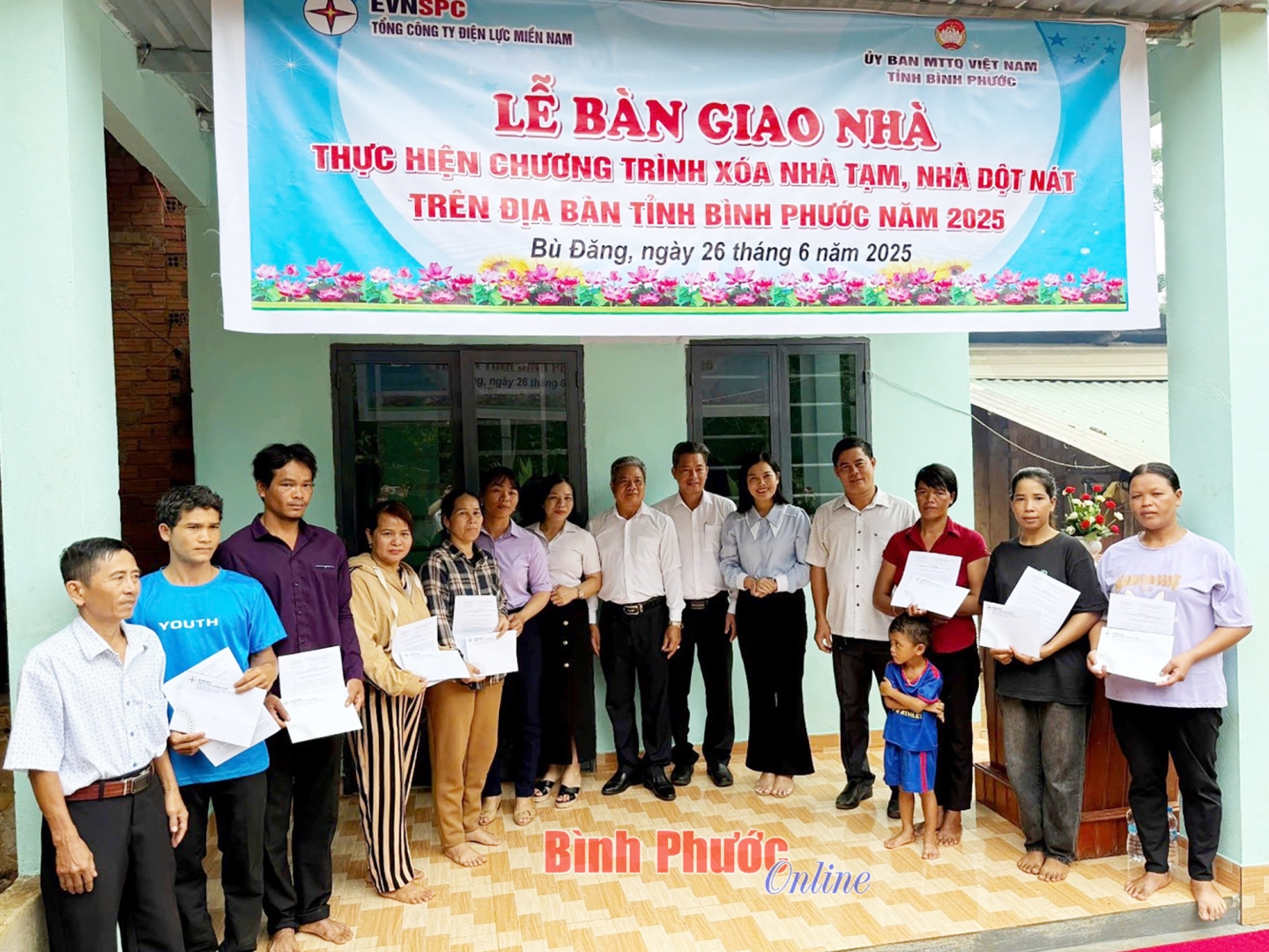 Lãnh đạo Ủy ban MTTQ Việt Nam tỉnh, Công ty Điện lực Bình Phước, huyện Bù Đăng trao quyết định bàn giao nhà cho các hộ dân ở xã Đoàn Kết