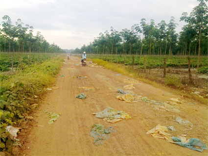 Rác không chỉ vứt dọc hai bên đường, mà còn được vứt ở giữa đường, gây cản trở giao thông và mùi hôi thối nồng nặc.