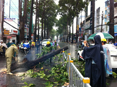 Tại thời điểm trên, trời mưa kèm theo gió mạnh, chiếc taxi 56M – 0326 do tài xế Nguyễn Văn Khôi (23 tuổi) đang chở 3 hành khách, lưu thông trên đường Nguyễn Thị Minh Khai, hướng đi bệnh viện Từ Dũ. Khi đến trước nhà sách Minh Khai, bất ngờ một nhánh cây từ bên kia đường gãy, rơi xuống đè xuống phần mui xe. Vụ tai nạn làm phần mui xe bị móp, lún xuống, bể kính chắn gió. Rất may, tài xế và hành khách chỉ bị thương nhẹ.