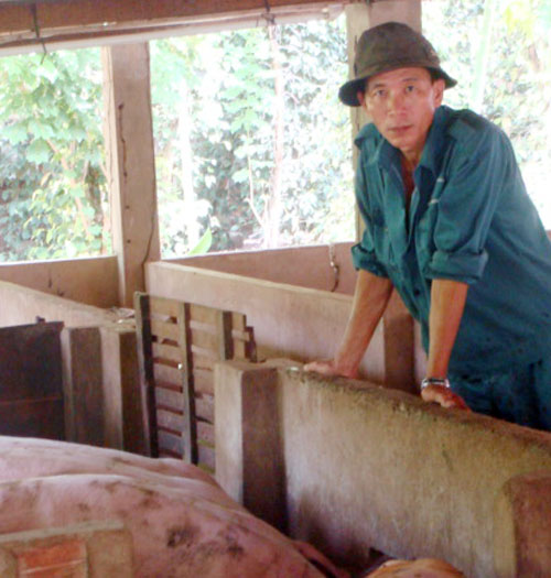 Anh Nguyễn Thanh Hải đang chăm sóc đàn heo của gia đình