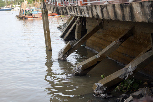 Các chân trụ bêtông đỡ hành lang căn nhà ven sông bị đuôi phà va gãy |