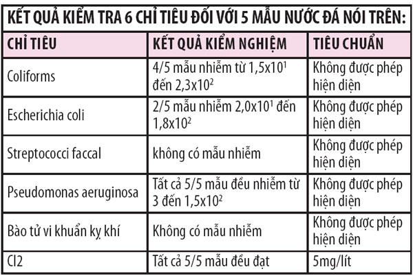 Kết quả kiểm nghiệm cho thấy 5/5 mẫu nước đá đều không đảm bảo ATVSTP. Cụ thể, mẫu nước đá lấy ở một quán cà phê trên đường Phan Văn Trị (Q.5) nhiễm vi khuẩn gây bệnh đường ruột Coliforms lên đến 2,3 x 102 (trong khi quy định bắt buộc đối với chỉ tiêu của nước đá thì loại vi khuẩn này không được phép hiện diện). Và nhiễm vi khuẩn đường ruột khác là Escherichia coli 1,8 x 102 (theo quy định cũng không được có). Ngoài ra, mẫu nước đá tại đây còn nhiễm cả trực khuẩn mủ xanh Pseudomonas 3 lần (quy định không cho phép hiện diện). Mẫu nước đá ở quán ăn trên đường Hòa Hảo (Q.10) cũng bị nhiễm trực khuẩn mủ xanh Pseudomonas khoảng 5x101.