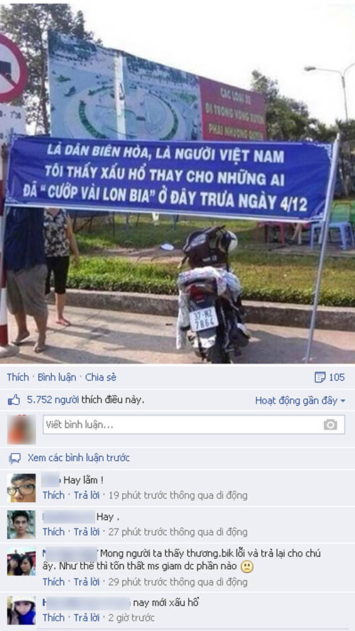 Bức ảnh chụp một người dân đang treo tấm băng rôn với nội dung "Là dân Biên Hòa, là người Việt Nam, tôi thấy xấu hổ thay cho những ai đã "cướp vài lon bia" ở đây trưa ngày 4-12".