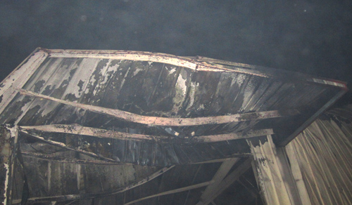Theo ghi nhận của PV, sức nóng khủng khiếp đã khiến mái tôn, khung thép của khu nhà xưởng rộng hàng ngàn mét vuông oằn xuống.