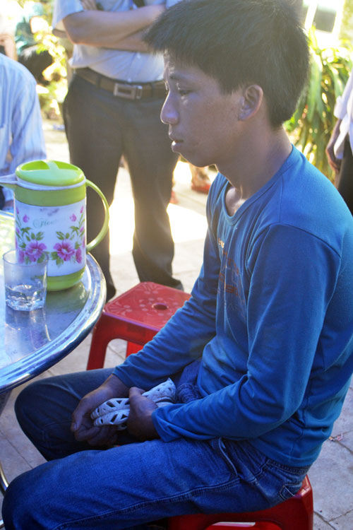 Anh Mai Văn Chương (31 tuổi, chồng chị Diệu) ngồi thẫn thờ, trên tay cầm đôi giày của con mình