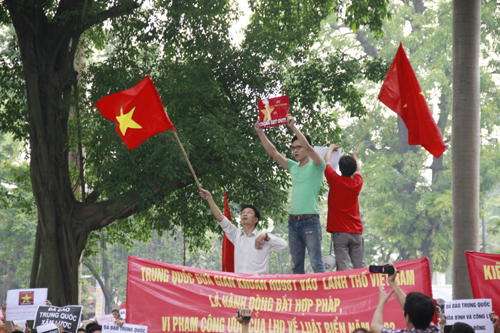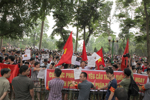 Hàng nghìn người tập trung tuần hành đứng trong khuôn viên vườn hoa Lê Nin (Hà Nội) phía đối diện căng băng rôn, hô khẩu hiệu phản đối Trung Quốc