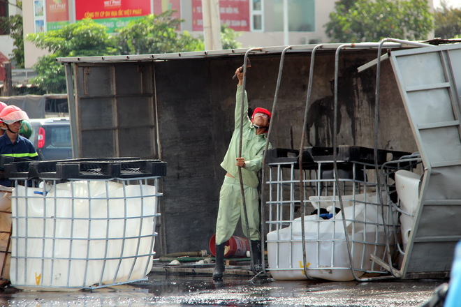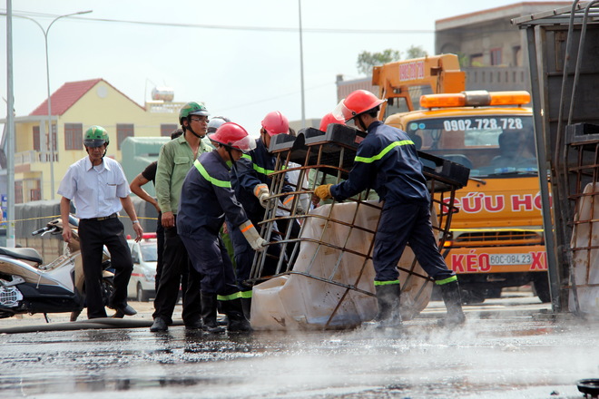 Trên ôtô chở 5 thùng, mỗi thùng chứa khoảng 1.000 lít axít. Tài xế cùng 2 nhân viên đi cùng tự rời khỏi cabin, bị thương nhẹ.
