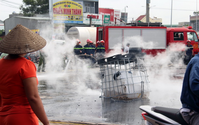 Đến 11h, cơ quan chức năng đã phải dùng một lượng nước lớn để tẩy rửa số axít trên đường nhưng khói vẫn không ngừng bốc lên.