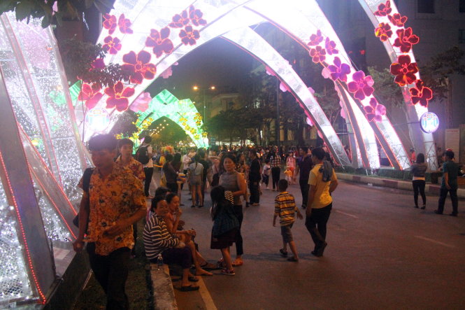 | Đường Hàm Nghi được trang hoàng lộng lẫy bởi hệ thống đèn màu nên thu hút người dân tham quan trong lúc chờ đến thời điểm bắn pháo hoa |