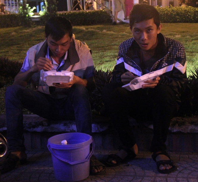 | Hoài và Thiệt - sinh viên trường đại học mang cả cơm hộp ra ăn khu vực bến Bạch Đằng chờ thời khắc chứng kiến bắn pháo hoa chào mừng năm mới |
